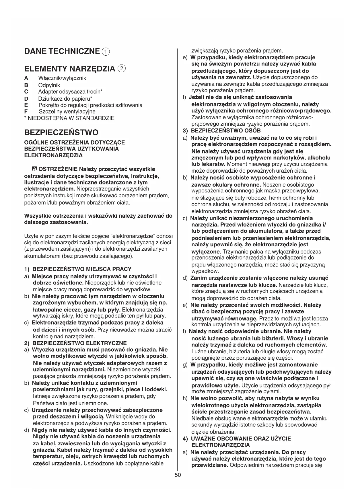 ELEKTRONARZĘDZIA - OSTRZEŻENIE Należy przeczytać wszystkie ostrzeżenia dotyczące bezpieczeństwa, instrukcje, ilustracje i dane techniczne dostarczone z tym elektronarzędziem. Nieprzestrzeganie wszystkich poniższych instrukcji może skutkować porażeniem prądem, pożarem i/lub poważnym obrażeniem ciała. Wszystkie ostrzeżenia i wskazówki należy zachować do dalszego zastosowania. Użyte w poniższym tekście pojęcie “elektronarzędzie” odnosi się do elektronarzędzi zasilanych energią elektryczną z sieci (z przewodem zasilającym) i do elektronarzędzi zasilanych akumulatorami (bez przewodu zasilającego).