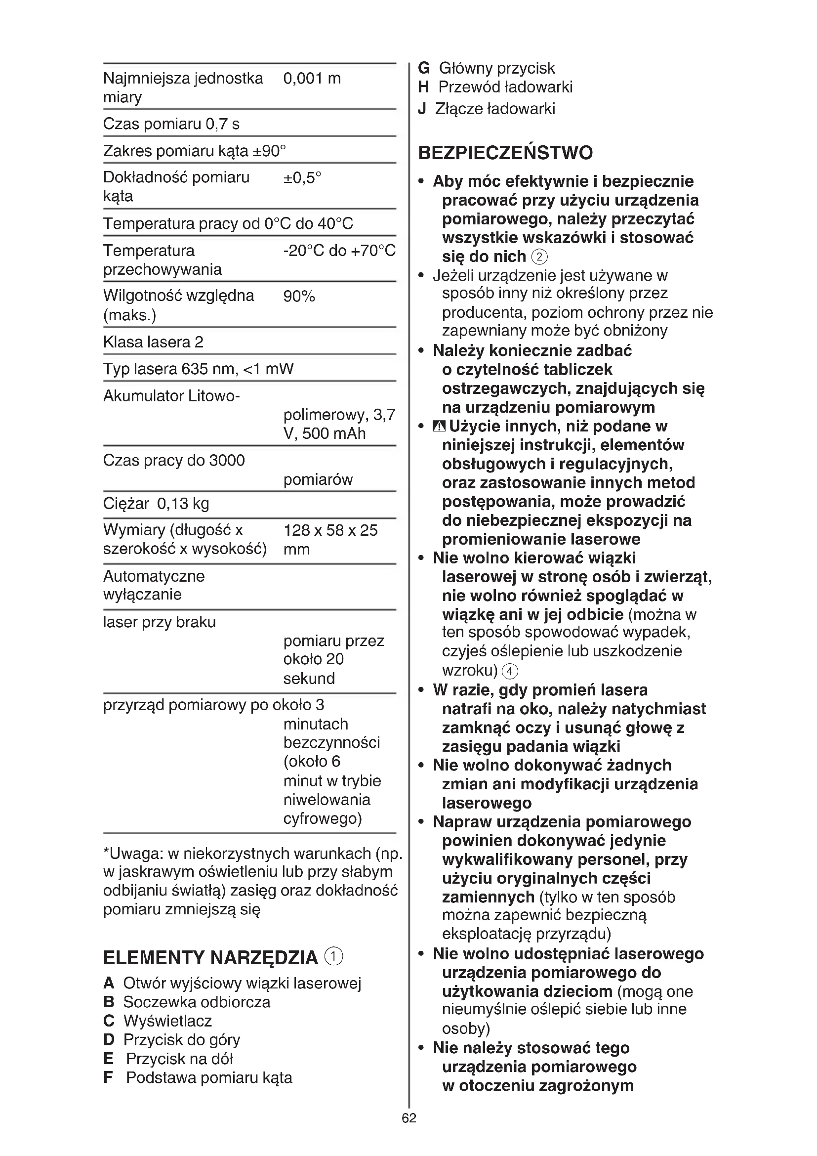 - Nie należy stosować tego urządzenia pomiarowego w otoczeniu zagrożonym Najmniejsza jednostka miary 0,001 m Czas pomiaru 0,7 s Zakres pomiaru kąta ±90° Dokładność pomiaru kąta ±0,5° Temperatura pracy od 0°C do 40°C Temperatura przechowywania -20°C do +70°C Wilgotność względna (maks.) 90% Klasa lasera 2 Typ lasera 635 nm, <1 mW Akumulator Litowo- polimerowy, 3,7 V, 500 mAh Czas pracy do 3000 pomiarów Ciężar 0,13 kg Wymiary (długość x szerokość x wysokość) 128 x 58 x 25