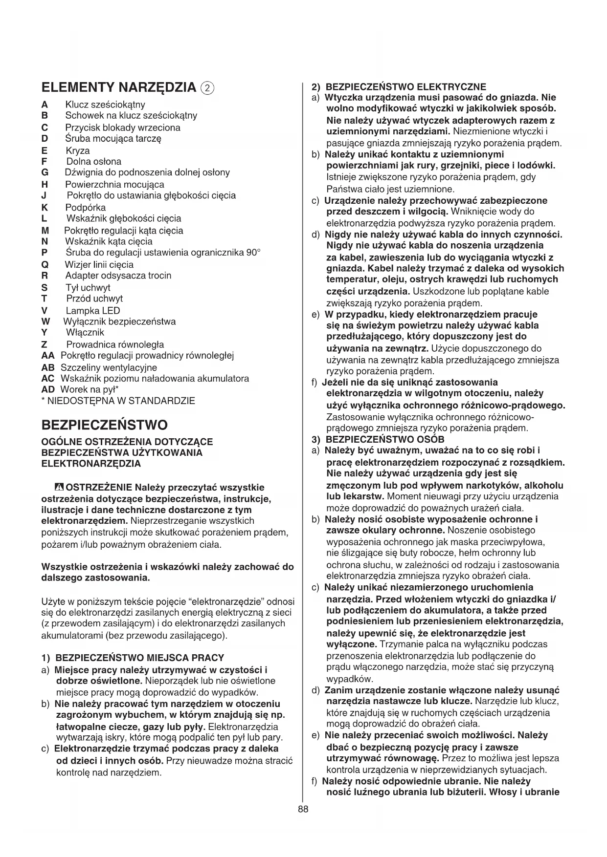 A Klucz sześciokątny B Schowek na klucz sześciokątny C Przycisk blokady wrzeciona D Śruba mocująca tarczę E Kryza F Dolna osłona G Dźwignia do podnoszenia dolnej osłony H Powierzchnia mocująca J Pokrętło do ustawiania głębokości cięcia K Podpórka L Wskaźnik głębokości cięcia M Pokrętło regulacji kąta cięcia N Wskaźnik kąta cięcia P Śruba do regulacji ustawienia ogranicznika 90° Q Wizjer linii cięcia R Adapter odsysacza trocin S Tył uchwyt T Przód uchwyt V Lampka LED W Wyłącznik bezpieczeństwa Y Włącznik Z Prowadnica równoległa AA Pokrętło regulacji prowadnicy równoległej AB Szczeliny wentylacyjne AC Wskaźnik poziomu naładowania akumulatora AD Worek na pył*