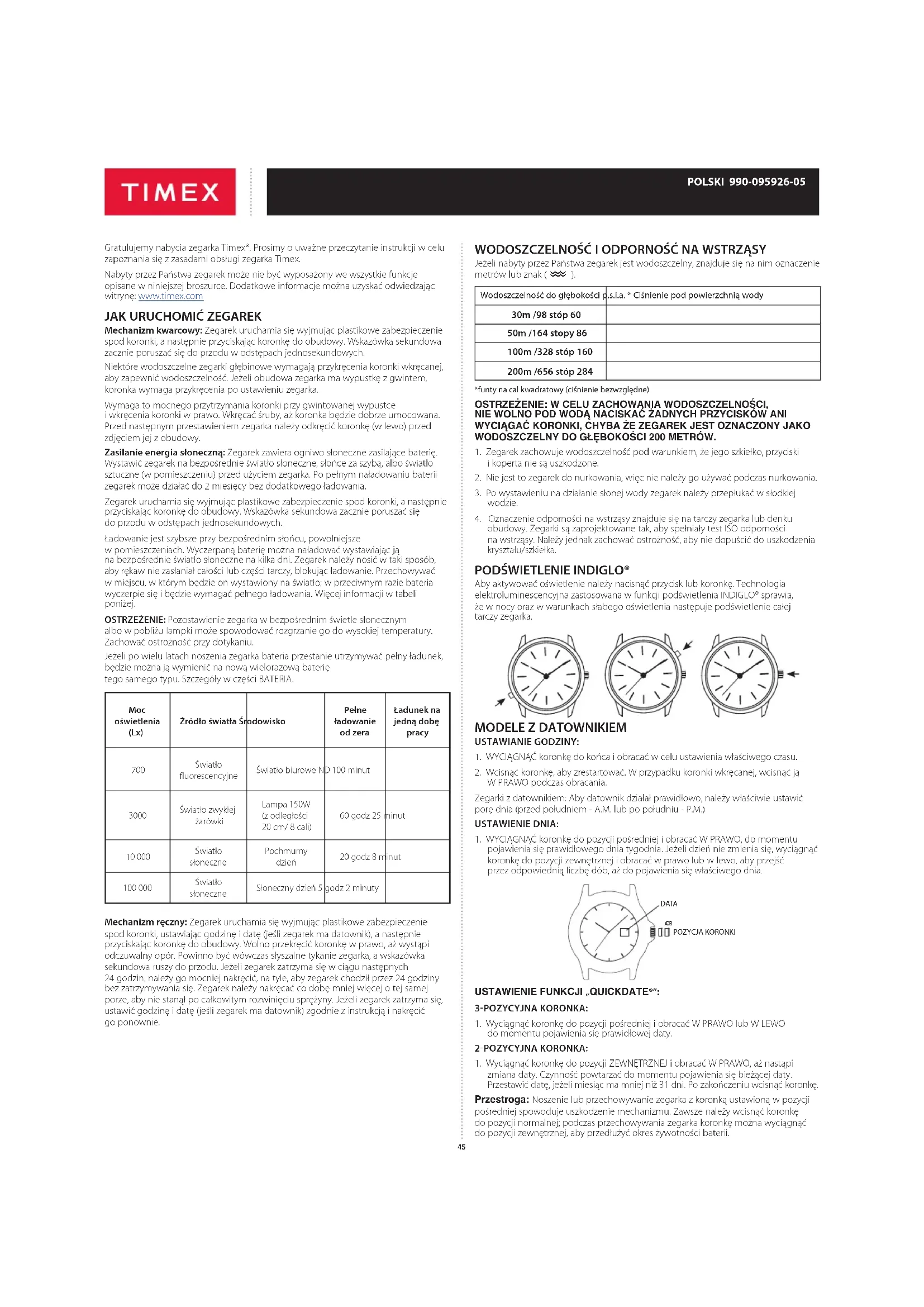 Gratulujemy nabycia zegarka Timex®. Prosimy o uważne przeczytanie instrukcji w celu zapoznania się z zasadami obsługi zegarka Timex. Nabyty przez Państwa zegarek może nie być wyposażony we wszystkie funkcje opisane w niniejszej broszurce. Dodatkowe informacje można uzyskać odwiedzając witrynę: www.timex.com
