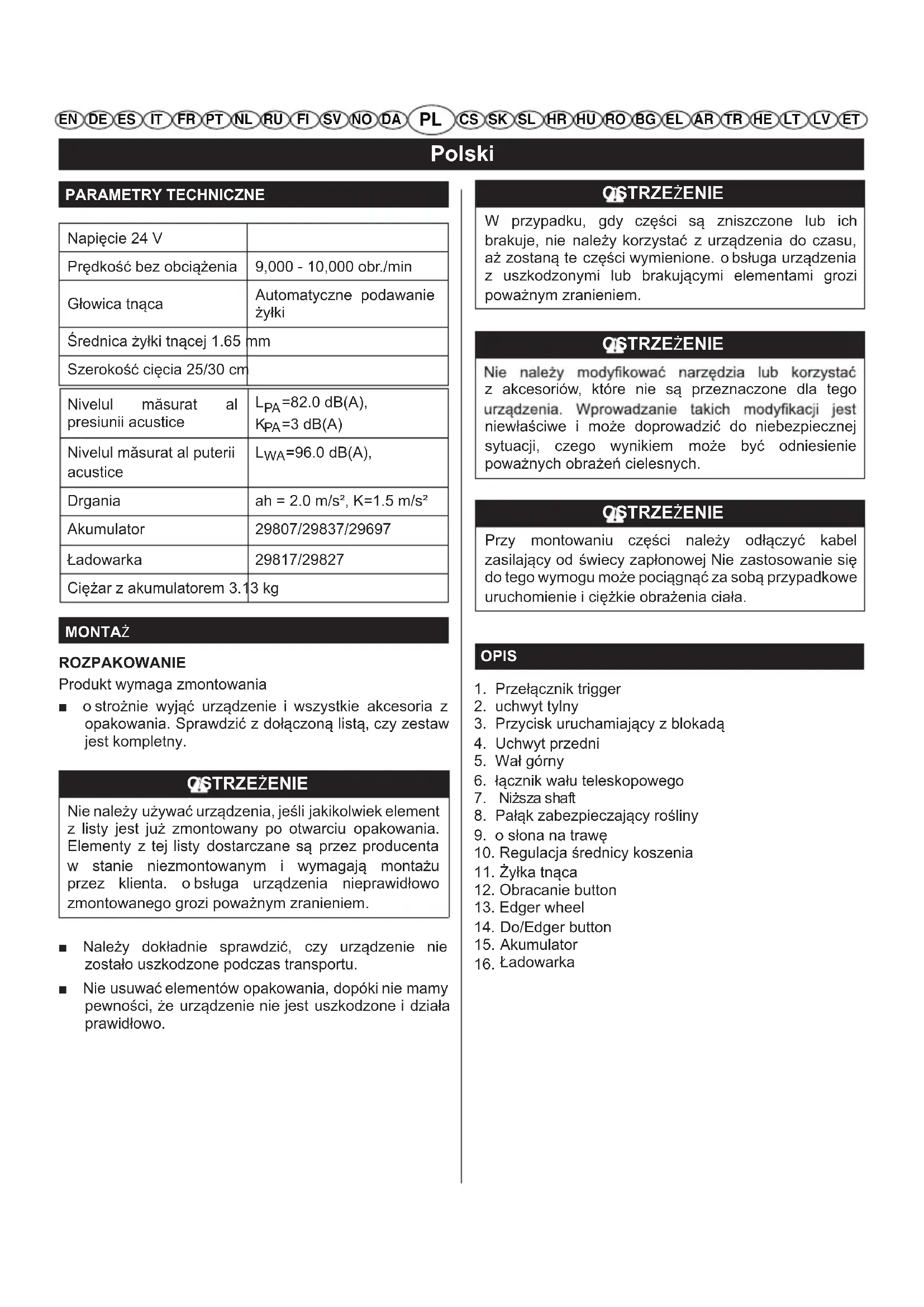 EN DE ES IT FR PT NL RU FI SV NO PL CS SK SL HR HU RO BG EL AR TR HE LT LV ETPolski PARAMETRY TECHNICZNE Napięcie 24 V Prędkość bez obciążenia 9,000 - 10,000 obr./min Głowica tnąca Automatyczne podawanie żyłki Średnica żyłki tnącej 1.65 mm Szerokość cięcia 25/30 cm MONTAŻ ROZPAKOWANIE Produkt wymaga zmontowania ■ o strożnie wyjąć urządzenie i wszystkie akcesoria z opakowania. Sprawdzić z dołączoną listą, czy zestaw jest kompletny. OSTRZEŻENIE Nie należy używać urządzenia, jeśli jakikolwiek element z listy jest już zmontowany po otwarciu opakowania. Elementy z tej listy dostarczane są przez producenta w stanie niezmontowanym i wymagają montażu przez klienta. o bsługa urządzenia nieprawidłowo zmontowanego grozi poważnym zranieniem. ■ Należy dokładnie sprawdzić, czy urządzenie nie zostało uszkodzone podczas transportu. ■ Nie usuwać elementów opakowania, dopóki nie mamy pewności, że urządzenie nie jest uszkodzone i działa prawidłowo. Akumulator Ładowarka OSTRZEŻENIE W przypadku, gdy części są zniszczone lub ich brakuje, nie należy korzystać z urządzenia do czasu, aż zostaną te części wymienione. o bsługa urządzenia z uszkodzonymi lub brakującymi elementami grozi poważnym zranieniem. OSTRZEŻENIE z akcesoriów, które nie są przeznaczone dla tego niewłaściwe i może doprowadzić do niebezpiecznej sytuacji, czego wynikiem może być odniesienie poważnych obrażeń cielesnych. OSTRZEŻENIE Przy montowaniu części należy odłączyć kabel zasilający od świecy zapłonowej Nie zastosowanie się do tego wymogu może pociągnąć za sobą przypadkowe uruchomienie i ciężkie obrażenia ciała. OPIS