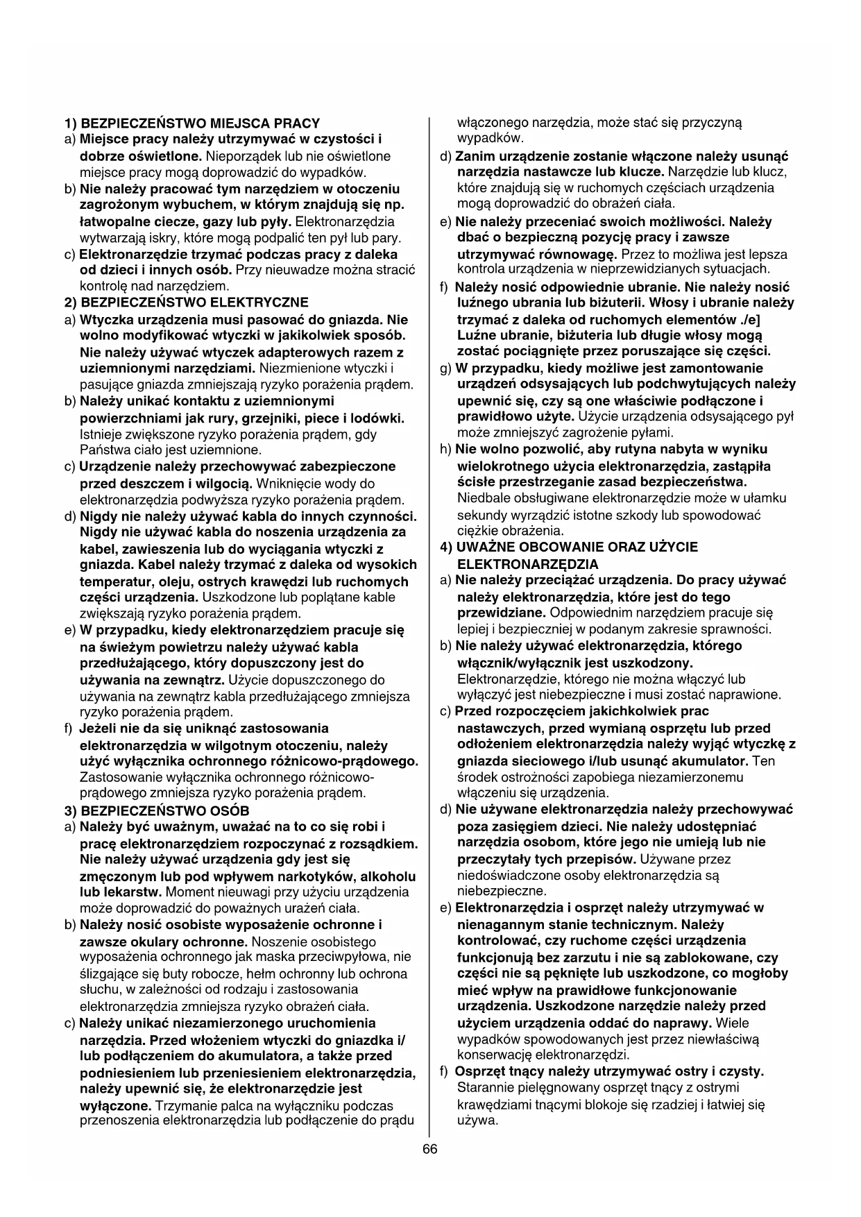 ELEKTRONARZĘDZIA OSTRZEZENIE Należy przeczytać wszystkie ostrzeżenia i wskazówki dotyczące bezpieczeństwa użytkowania oraz przestudiować wszystkie rysunki i parametry techniczne, dostarczone wraz z niniejszym elektronarzędziem. Nieprzestrzeganie poniższych wskazówek może stać się przyczyną porażenia prądem elektrycznym, pożaru lub/i poważnych obrażeń ciała. Wszystkie ostrzeżenia i wskazówki należy zachować do dalszego zastosowania. Użyte w poniższym tekście pojęcie “elektronarzędzie” odnosi się do elektronarzędzi zasilanych energią elektryczną z sieci (z przewodem zasilającym) i do elektronarzędzi zasilanych akumulatorami (bez przewodu zasilającego).66