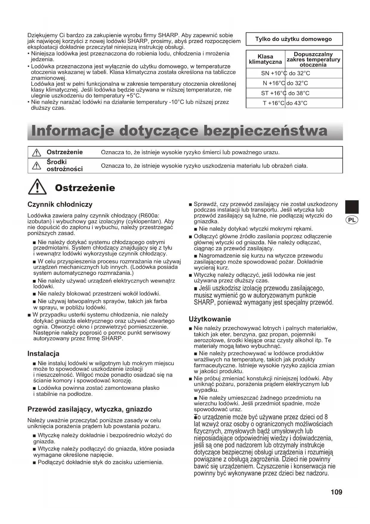 To urządzenie może być używane przez dzieci od 8 lat wzwyż oraz osoby o ograniczonych możliwościach zycznych, zmysłowych bądź umysłowych lub nieposiadające odpowiedniej wiedzy i doświadczenia, jeśli są one pod nadzorem lub otrzymały instrukcje dotyczące bezpiecznej obsługi urządzenia i rozumieją powiązane z obsługą zagrożenia. Dzieci nie powinny bawić się urządzeniem. Czyszczenie i konserwacja nie powinny być wykonywane przez dzieci bez nadzoru. Klasa klimatyczna Dopuszczalny zakres temperatury otoczenia SN +10°C do 32°C N +16°C do 32°C ST +16°C do 38°C T +16°C do 43°C Informacje dotyczące bezpieczeństwa Ostrzeżenie Oznacza to, że istnieje wysokie ryzyko śmierci lub poważnego urazu. Środki ostrożności Oznacza to, że istnieje wysokie ryzyko uszkodzenia materiału lub obrażeń ciała. Ostrzeżenie (B656)E_1.indb 109 2015/05/20 11:38:47110 Czyszczenie lodówki ■ Aby uniknąć porażenia prądem elektrycznym, najpierw odłącz lodówkę od gniazdka elektrycznego w ścianie. ■ Unikaj pryskania wodą bezpośrednio na obudowę lub do środka lodówki. Może to doprowadzić do zardzewienia części oraz do uszkodzenia izolacji przewodów elektrycznych. Problem ■ Jeśli czuć zapach spalenizny, należy natychmiast wyciągnąć wtyczkę z gniazda. Następnie należy poprosić o pomoc punkt serwisowy autoryzowany przez rmę SHARP. ■ W przypadku przecieku gazu, należy otworzyć okno i przewietrzyć pomieszczenie. Nie należy dotykać lodówki lub gniazda. Utylizacja ■ Dopilnuj by lodówka nie stanowiła zagrożenia dla dzieci podczas przechowywania do utylizacji (np. usuń magnetyczne uszczelki drzwi, żeby zapobiec ewentualnemu zatrzaśnięciu dziecka.) ■ Niniejsza lodówka powinna być odpowiednio utylizowana. Należy oddać ją do profesjonalnego zakładu recyklingu przeznaczonego do recyklingu łatwopalnego czynnika chłodzącego z gazami izolacyjnymi. Transport ■ Podczas montażu lub przenoszenia lodówki, należy używać twardej podkładki, aby zapobiec zniszczeniu podłoża. ■ Przenoś lodówkę trzymając ją za uchwyty z tyłu i na spodzie. Nieprawidłowe podniesienie lodówki może spowodować obrażenia ciała. Środki ostrożności Użytkowanie ■ Nie dotykaj zespołu sprężarki ani części zewnętrznych, ponieważ nagrzewają się one podczas pracy lodówki, a metalowe brzegi mogą spowodować uszkodzenie ciała. ■ Nie należy dotykać żywności ani metalowych pojemników w komorze zamrażarki wilgotnymi rękami. Może to spowodować odmrożenie. ■ Nie należy umieszczać napojów w butelkach i puszkach w zamrażarce. Wysokie ryzyko wybuchu szklanej butelki istnieje zwłaszcza, gdy włączona jest funkcja „Szybkie chłodzenie”. ■ Do robienia kostek lodu nie należy używać wody innej niż woda pitna. ■ Nie należy otwierać lub zamykać drzwi, gdy inna osoba ma rękę w pobliżu drzwi. Istnieje ryzyko przytrzaśnięcia palców innych osób. ■ Nie należy umieszczać przedmiotów o zbyt dużych rozmiarach na półki na drzwiach. Jeśli przedmiot wypadnie z półki, może spowodować obrażenia ciała. Wskaźnik temperatury tył spód Lodówka wyposażona jest we wskaźnik temperatury w komorze lodówki, żeby umożliwić Ci kontrolę temperatury w najchłodniejszej części. Najchłodniejsza część Ten symbol wskazuje najchłodniejszą część w komorze lodówki. (Pojemnik w drzwiach umieszczony na tej samej wysokości nie jest najchłodniejszą częścią komory lodówki.) Sprawdzanie temperatury w najchłodniejszej części urządzenia Aby zapewnić właściwą temperaturę w najchłodniejszej części, należy okresowo sprawdzać temperaturę i w razie potrzeby dokonywać regulacji temperatury chłodzenia. Aby utrzymać wewnątrz urządzenia właściwą temperaturę, należy sprawdzać czy wskaźnik temperatury świeci na NIEBIESKO. Jeżeli wskaźnik temperatury świeci na BIAŁO, temperatura jest zbyt wysoka. W takim przypadku należy dokonać regulacji temperatury chłodzenia i odczekać 6 godzin przed ponownym sprawdzeniem wskazania wskaźnika temperatury. UWAGA