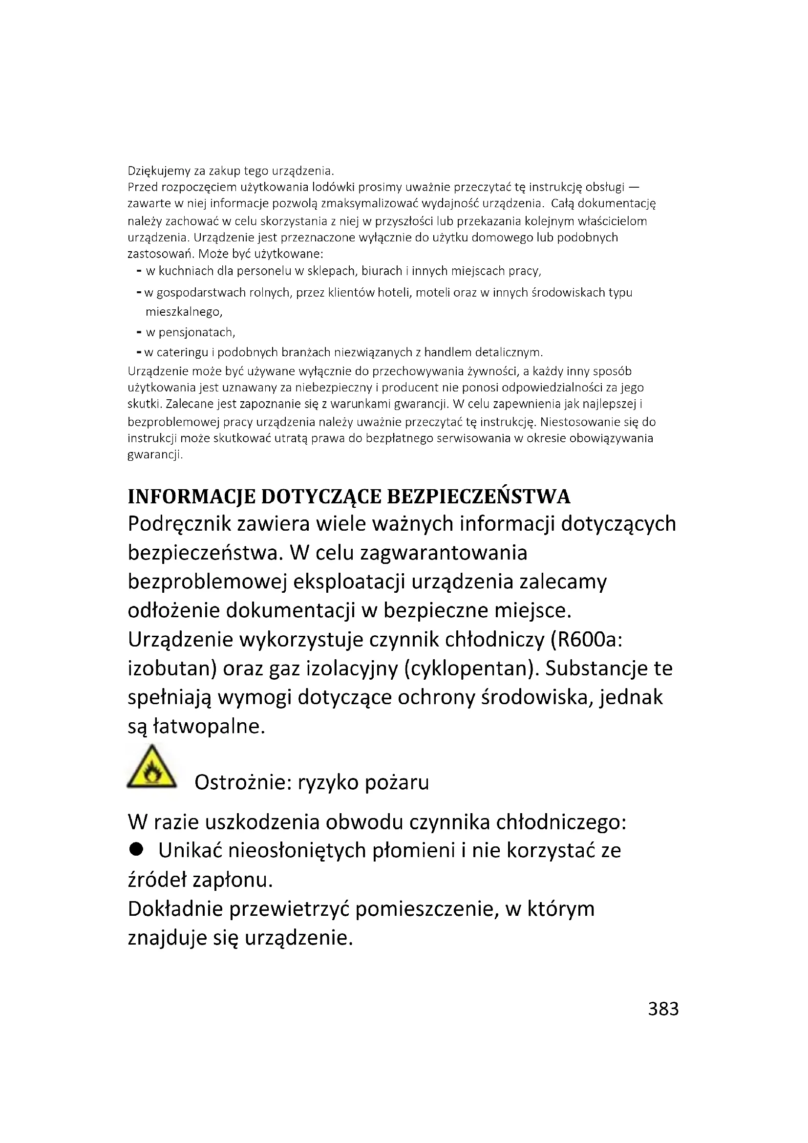 ROZWIĄZYWANIE PROBLEMÓW ..................................................................................................... 407383 Dziękujemy za zakup tego urządzenia. Przed rozpoczęciem użytkowania lodówki prosimy uważnie przeczytać tę instrukcję obsługi — zawarte w niej informacje pozwolą zmaksymalizować wydajność urządzenia. Całą dokumentację należy zachować w celu skorzystania z niej w przyszłości lub przekazania kolejnym właścicielom urządzenia. Urządzenie jest przeznaczone wyłącznie do użytku domowego lub podobnych zastosowań. Może być użytkowane: - w kuchniach dla personelu w sklepach, biurach i innych miejscach pracy, - w gospodarstwach rolnych, przez klientów hoteli, moteli oraz w innych środowiskach typu mieszkalnego, - w pensjonatach, - w cateringu i podobnych branżach niezwiązanych z handlem detalicznym. Urządzenie może być używane wyłącznie do przechowywania żywności, a każdy inny sposób użytkowania jest uznawany za niebezpieczny i producent nie ponosi odpowiedzialności za jego skutki. Zalecane jest zapoznanie się z warunkami gwarancji. W celu zapewnienia jak najlepszej i bezproblemowej pracy urządzenia należy uważnie przeczytać tę instrukcję. Niestosowanie się do instrukcji może skutkować utratą prawa do bezpłatnego serwisowania w okresie obowiązywania gwarancji.