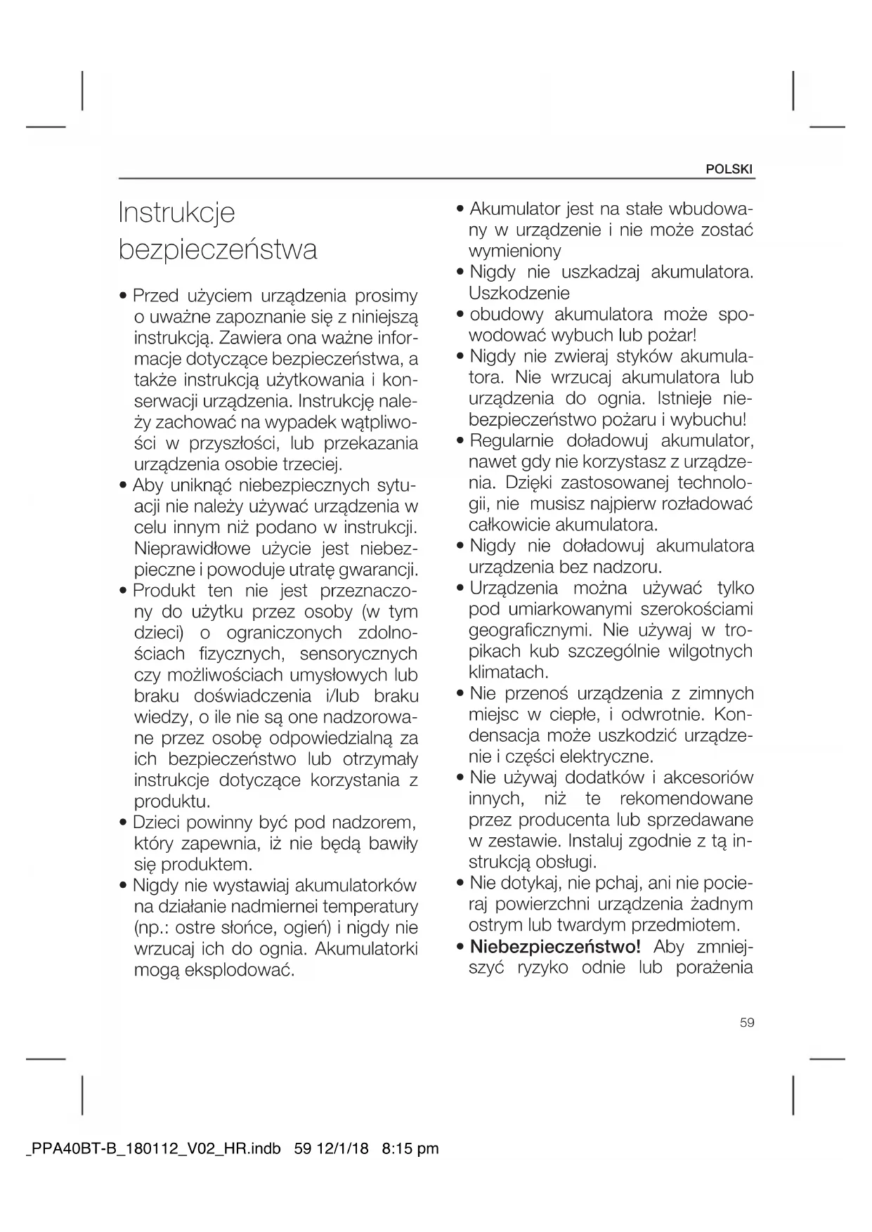 - Niebezpieczeństwo! Aby zmniej- szyć ryzyko odnie lub porażenia IM_PPA40BT-B_180112_V02_HR.indb 59 12/1/18 8:15 pmPOLSKI