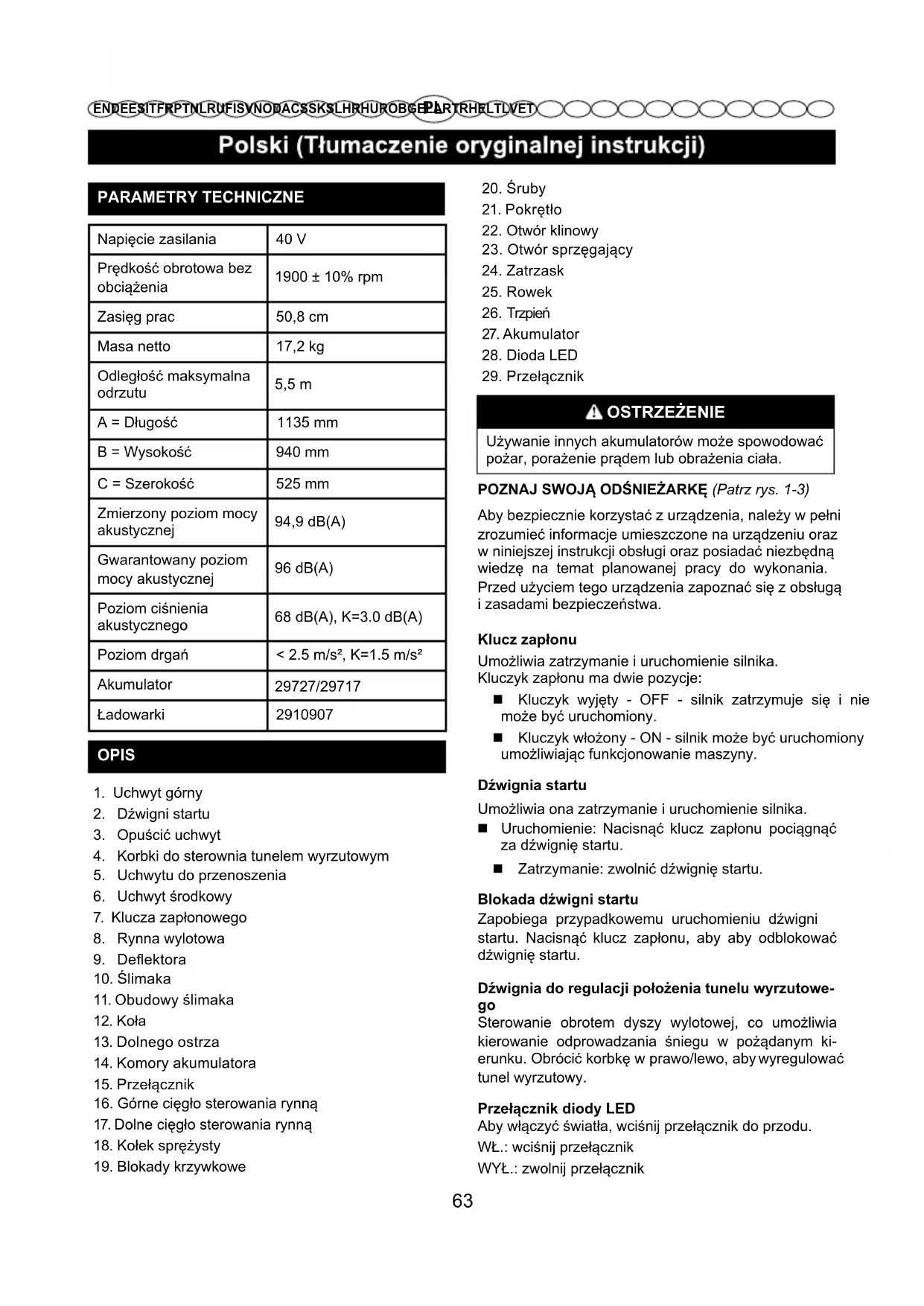 Odśnieżarka Górne cięgło sterowania rynną Dolne cięgło sterowania rynną Zespół uchwytu środkowego Deflektor rynny Blokady krzywkowe Śruby Pokrętła Kołek sprężysty Klucz zapłonu Instrukcje OSTRZEŻENIE W przypadku uszkodzenia lub braku dowolnego podzespołu urządzenia, nie wolno go używać aż do wymiany podzespołu. Używanie urządzenia z uszkodzonymi lub brakującymi częściami może być przyczyną poważnych obrażeń ciała. 64PL EN DE ES IT FR PT NL RU FI SV NO DA CS SK SL HR HU RO BG EL AR TR HE LT LV ET