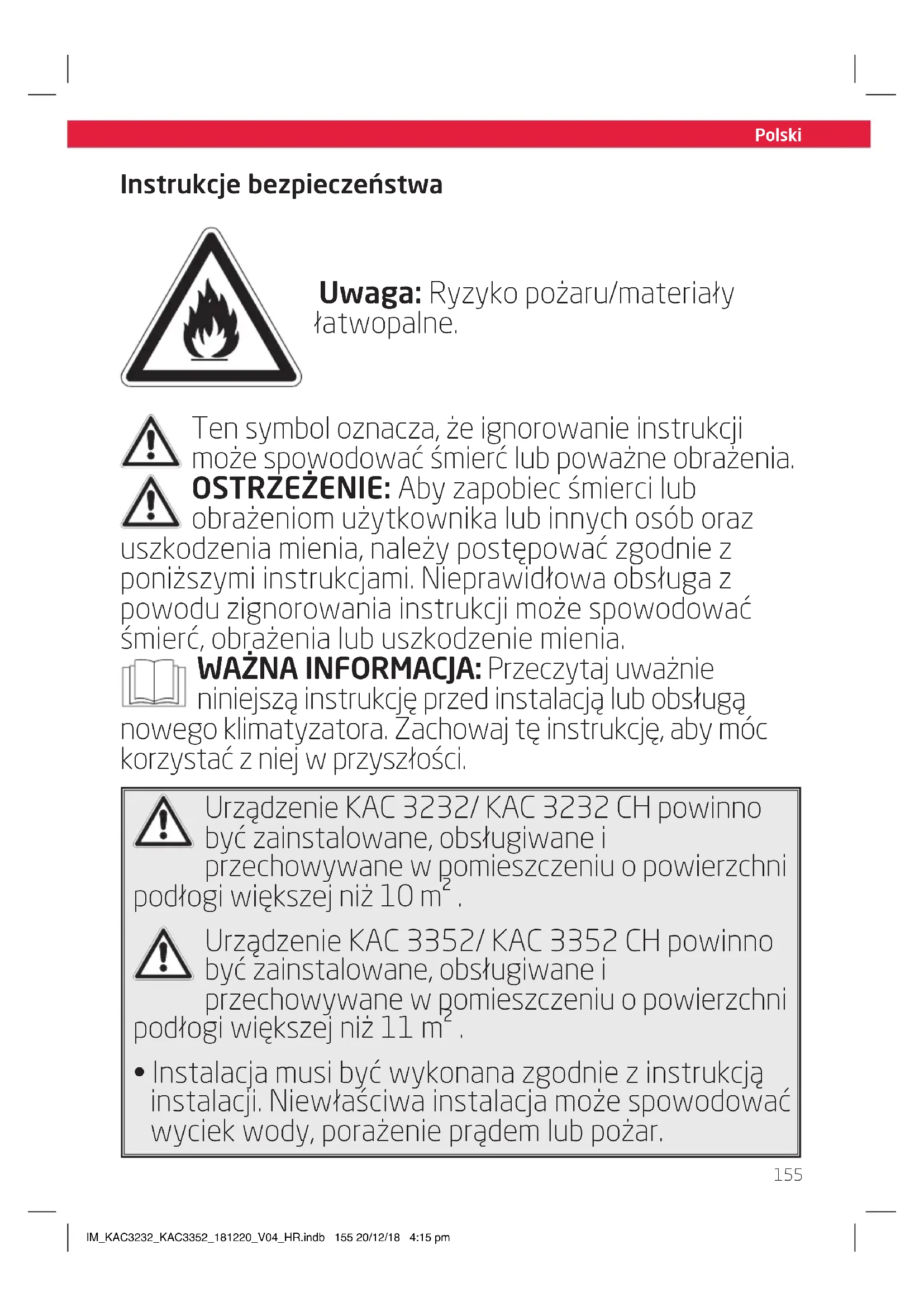Instrukcje bezpieczeństwa Uwaga: Ryzyko pożaru/materiały łatwopalne. Ten symbol oznacza, że ignorowanie instrukcji może spowodować śmierć lub poważne obrażenia. OSTRZEŻENIE: Aby zapobiec śmierci lub obrażeniom użytkownika lub innych osób oraz uszkodzenia mienia, należy postępować zgodnie z poniższymi instrukcjami. Nieprawidłowa obsługa z powodu zignorowania instrukcji może spowodować śmierć, obrażenia lub uszkodzenie mienia. WAŻNA INFORMACJA: Przeczytaj uważnie niniejszą instrukcję przed instalacją lub obsługą nowego klimatyzatora. Zachowaj tę instrukcję, aby móc korzystać z niej w przyszłości. Urządzenie KAC 3232/ KAC 3232 CH powinno być zainstalowane, obsługiwane i przechowywane w pomieszczeniu o powierzchni podłogi większej niż 10 m² . Urządzenie KAC 3352/ KAC 3352 CH powinno być zainstalowane, obsługiwane i przechowywane w pomieszczeniu o powierzchni podłogi większej niż 11 m² .