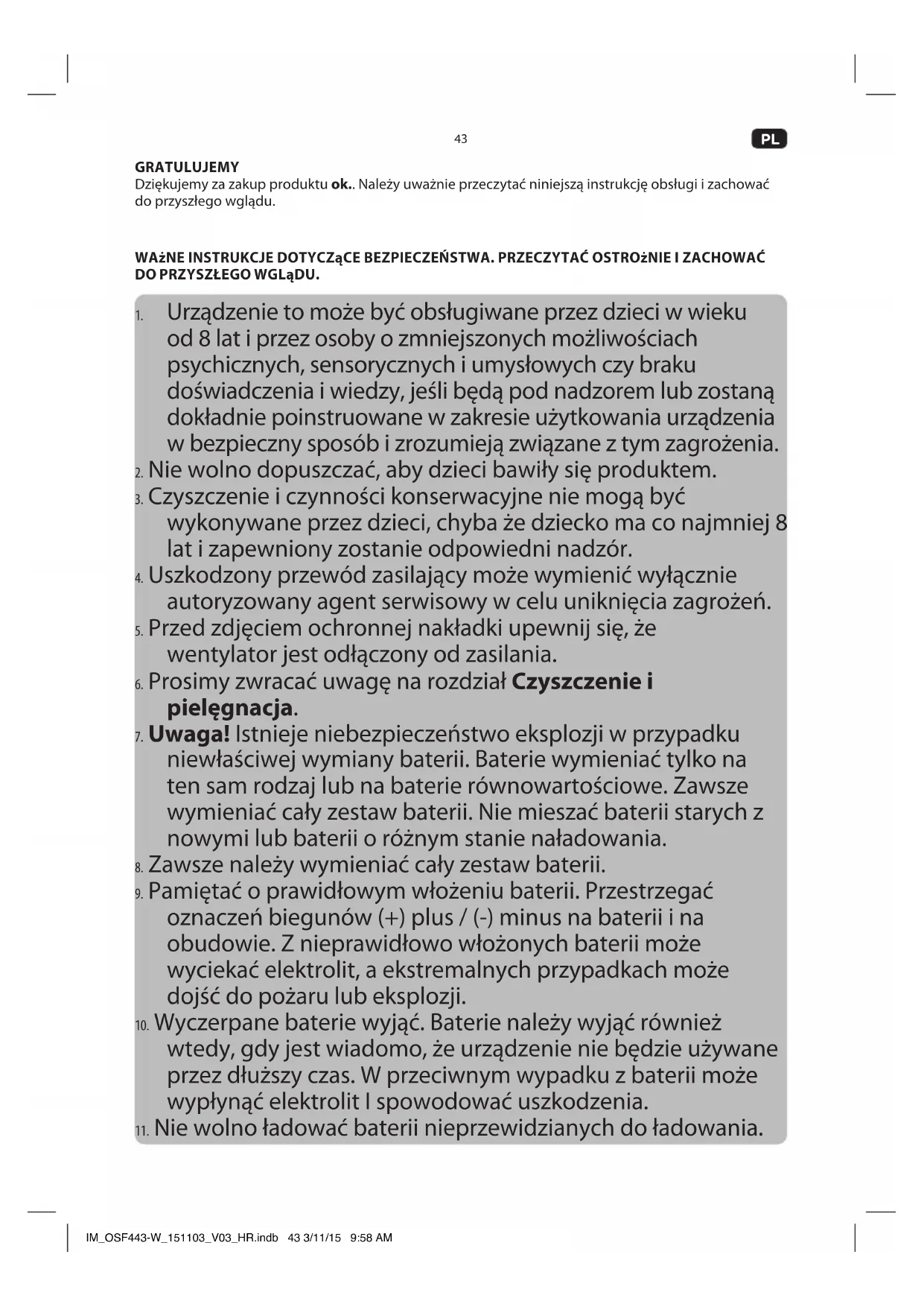 - Po wypakowaniu urządzenia zapoznaj się z rozdziałem Czyszczenie i pielęgnacja. IM_OSF443-W_151103_V03_HR.indb 45 3/11/15 9:58 AM46