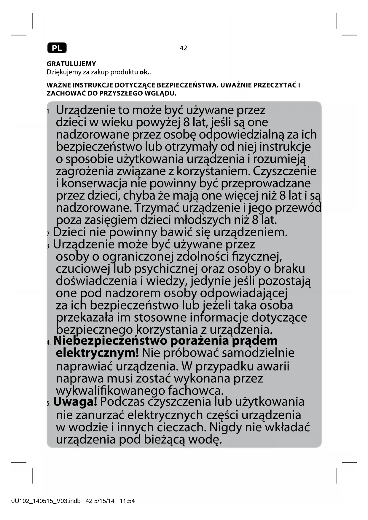 nie zanurzać elektrycznych części urządzenia w wodzie i innych cieczach. Nigdy nie wkładać urządzenia pod bieżącą wodę. IM_OJU102_140515_V03.indb 42 5/15/14 11:54 AMPL
