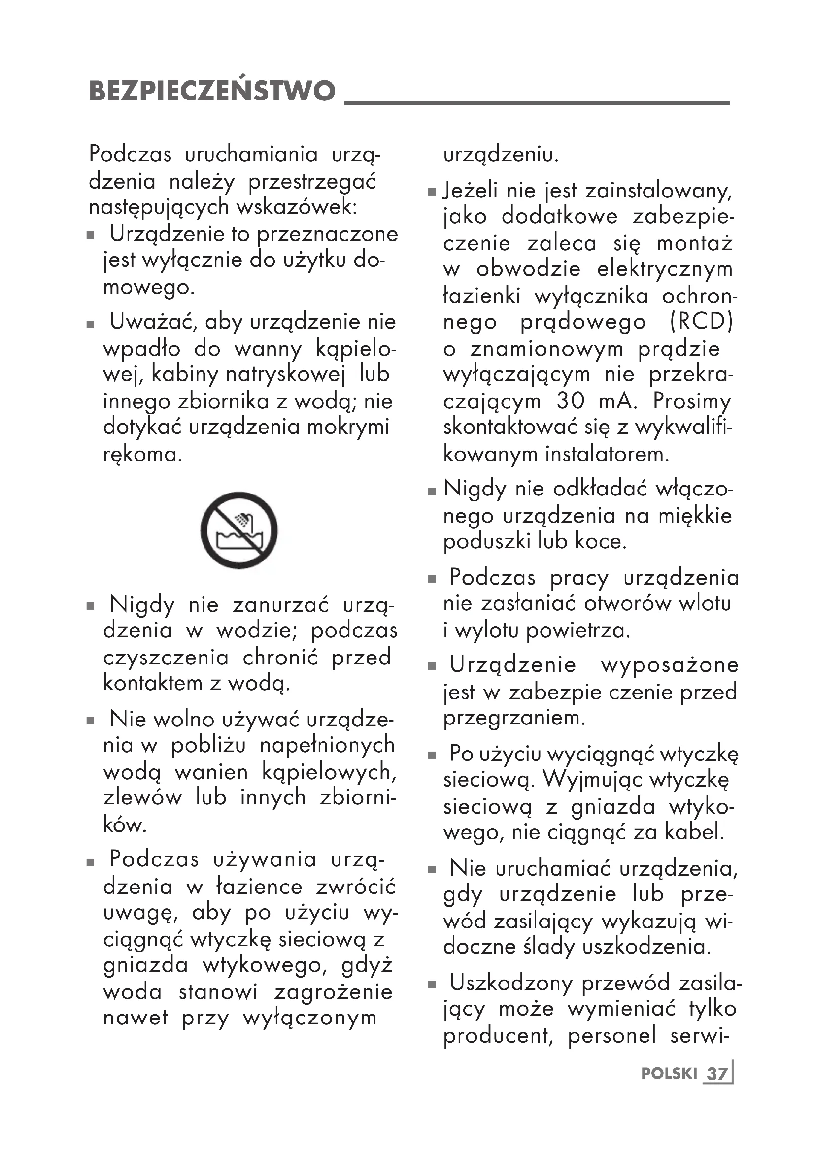 Podczas używania urzą- dzenia w łazience zwrócić uwagę, aby po użyciu wy- ciągnąć wtyczkę sieciową z gniazda wtykowego, gdyż woda stanowi zagrożenie nawet przy wyłączonym urządzeniu.