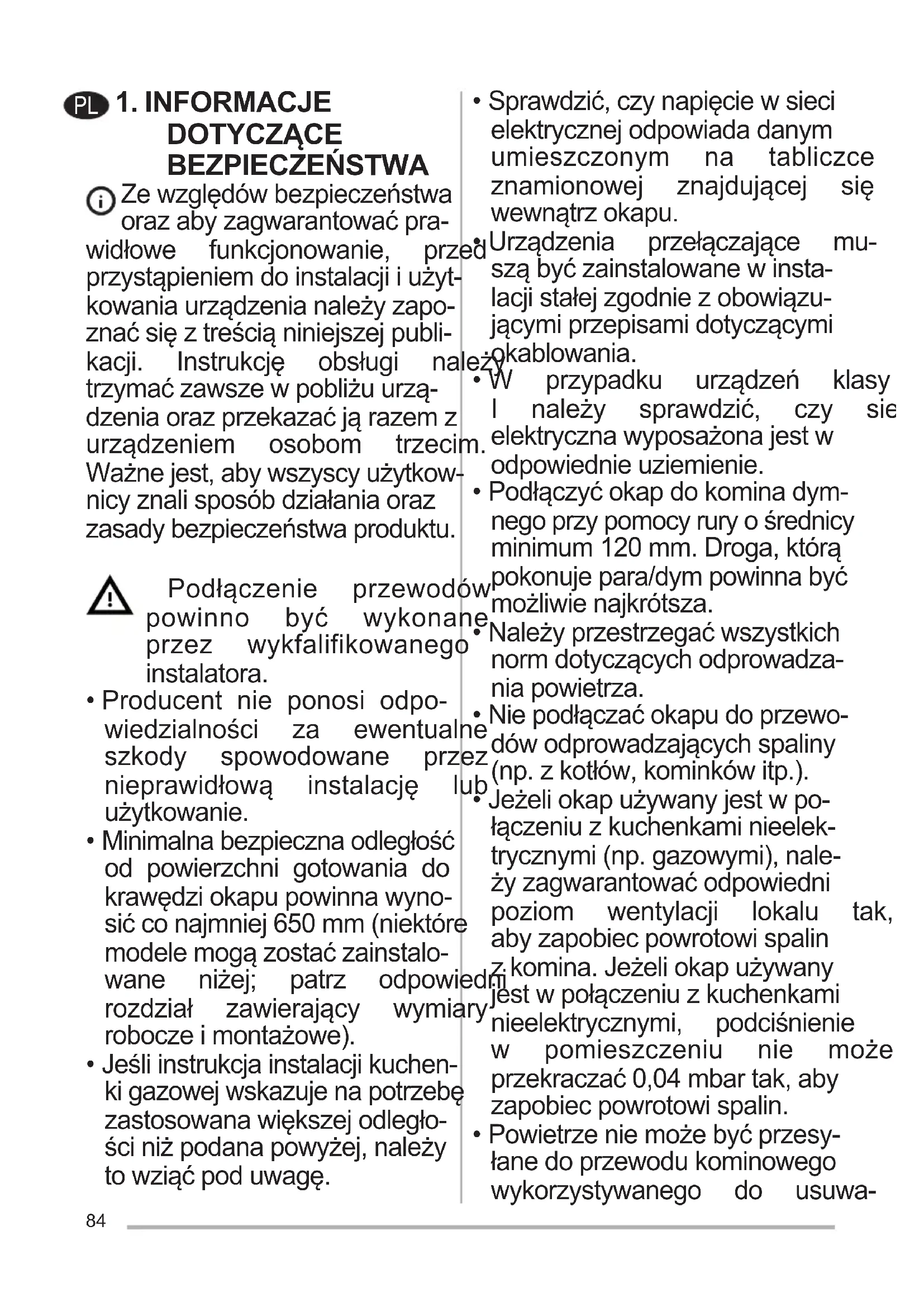 - Jeżeli okap używany jest jed- nocześniezurządzeniamispa- lającymigazlubinnepaliwa,w pomieszczeniunależyzapewnić86 odpowiednią wentylację (nie dotyczyurządzeń,którejedynie pobierająpowietrzezpomiesz- czenia).
