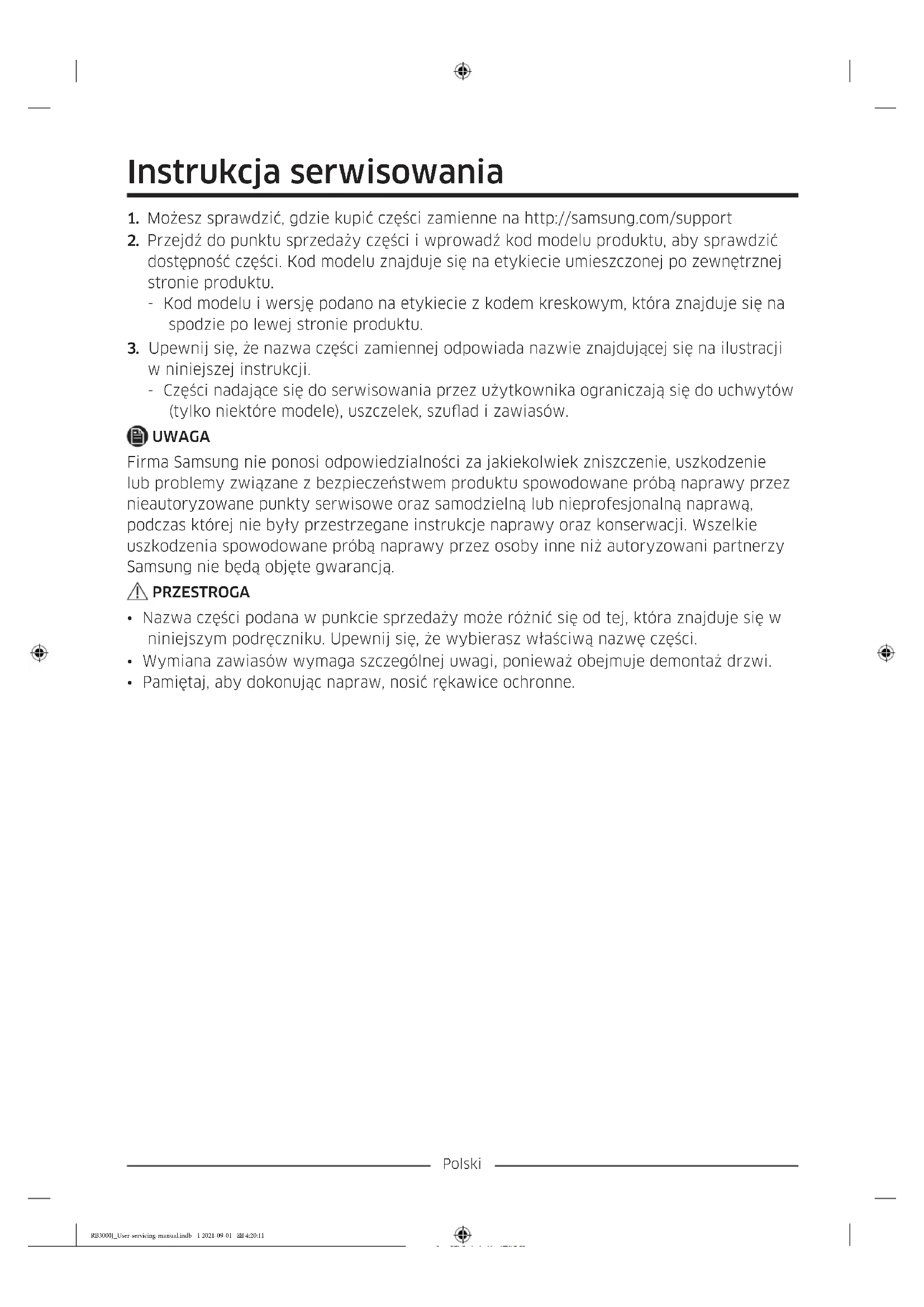 w niniejszej instrukcji. - Części nadające się do serwisowania przez użytkownika ograniczają się do uchwytów (tylko niektóre modele), uszczelek, szuad i zawiasów. UWAGA Firma Samsung nie ponosi odpowiedzialności za jakiekolwiek zniszczenie, uszkodzenie lub problemy związane z bezpieczeństwem produktu spowodowane próbą naprawy przez nieautoryzowane punkty serwisowe oraz samodzielną lub nieprofesjonalną naprawą, podczas której nie były przestrzegane instrukcje naprawy oraz konserwacji. Wszelkie uszkodzenia spowodowane próbą naprawy przez osoby inne niż autoryzowani partnerzy Samsung nie będą objęte gwarancją. PRZESTROGA