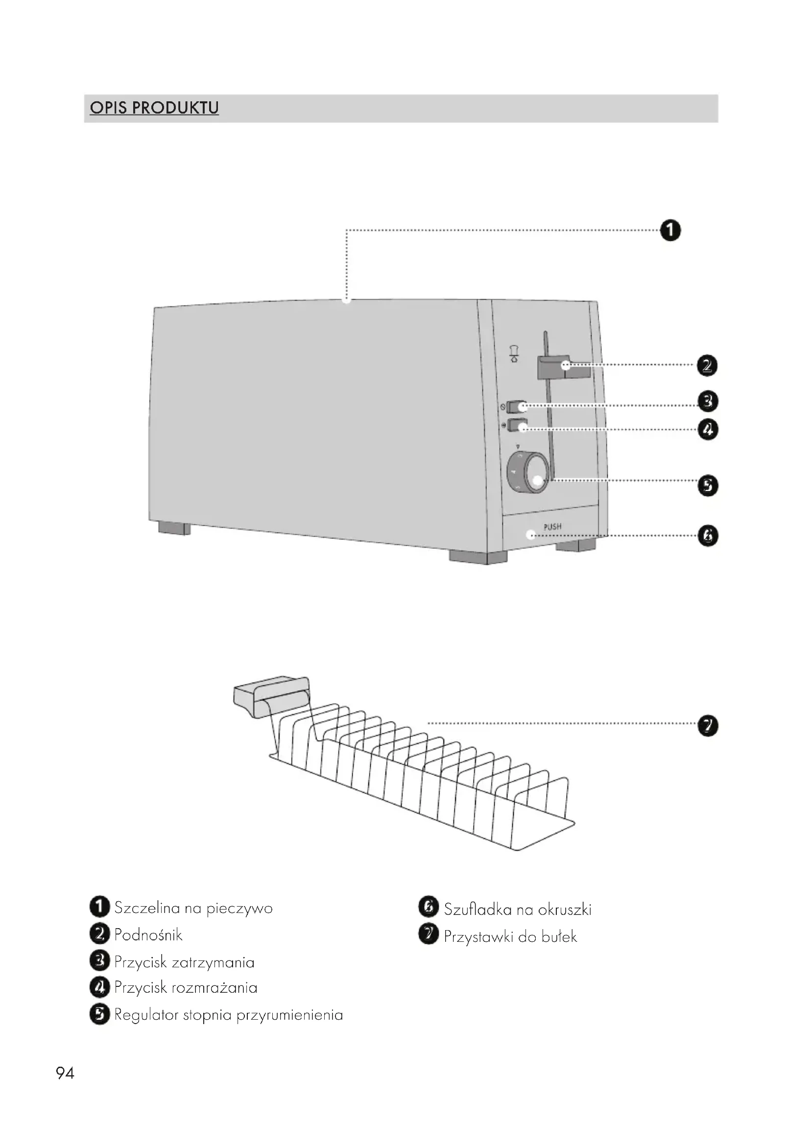 Aby odgrzać bułki, należy postępować w następujący sposób: ● Założyć przystawkę do bułek na urządzenie. ● Ułożyć bułki na przystawce do bułek. ● Ustawić regulator stopnia przyrumienienia na symbol bułki. ● Prosimy nacisnąć w dół przycisk podnoszenia, aż zatrzaśnie się na swoim miejscu. ● Gdy przycisk podnoszenia znajdzie się ponownie w górze, należy obrócić bułkę i powtó- rzyć proces. Przystawka do podgrzewania bułek jest gorąca podczas opiekania. Prosimy chwytać ją tylko za uchwyt. CZYSZCZENIE ● Prosimy czyścić zewnętrzne powierzchnie urządzenia miękką, zwilżoną szmatką. W razie silnego zanieczyszczenia można użyć łagodnego roztworu środka czyszczącego. ● Odpadające okruszki zbierają się w szufladce. ● Aby wyjąć szufladkę na okruszki, należy nacisnąć przycisk popchnięcia „Push". ● Prosimy wyjąć szufladkę na okruszki i usunąć jej zawartość. ● Włożyć szufladkę na okruszki z powrotem na miejsce.103