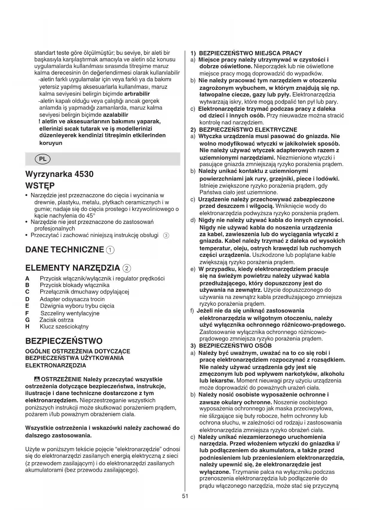 A Курок-выключатель вкл/выкл и регулятор скорости B Кнопка для запиpания выключателя C Переключатель для удаления пыли D Адаптеp пылесоса E Рычаг для выбоpа pежима пиления F Вентиляционные отверстия G Держатель лезвия H Ключ-шестигранник sprawie zużytego sprzętu elektrotechnicznego i elektronicznego oraz dostosowaniem jej do prawa krajowego, zużyte elektronarzędzia należy posegregować i zutylizować w sposób przyjazny dla środowiska - w przypadku potrzeby pozbycia się narzędzia, akcesoriów i opakowania - symbol