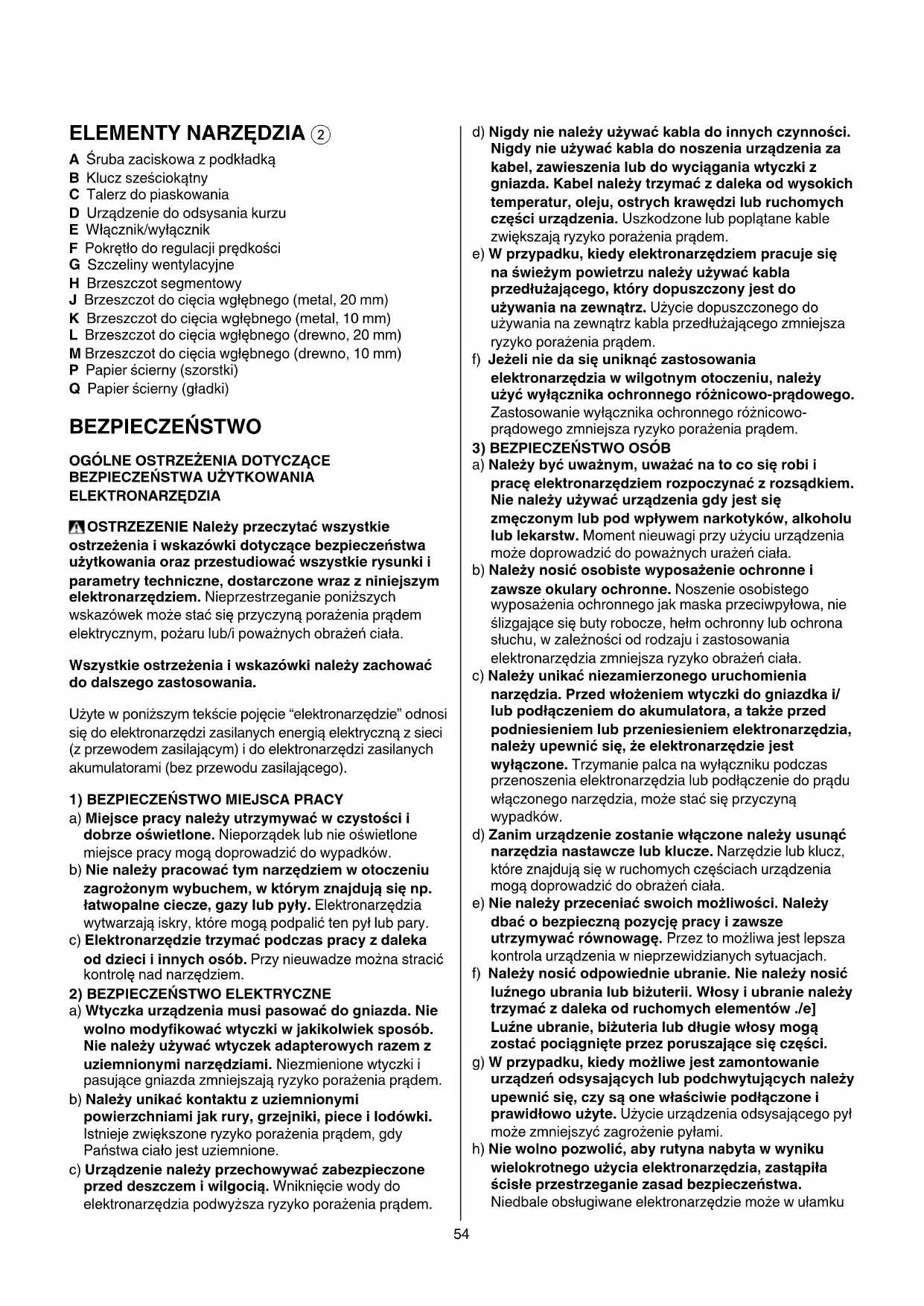 A Śruba zaciskowa z podkładką B Klucz sześciokątny C Talerz do piaskowania D Urządzenie do odsysania kurzu E Włącznik/wyłącznik F Pokrętło do regulacji prędkości G Szczeliny wentylacyjne H Brzeszczot segmentowy J Brzeszczot do cięcia wgłębnego (metal, 20 mm) K Brzeszczot do cięcia wgłębnego (metal, 10 mm) L Brzeszczot do cięcia wgłębnego (drewno, 20 mm) M Brzeszczot do cięcia wgłębnego (drewno, 10 mm) P Papier ścierny (szorstki) Q Papier ścierny (gładki) BEZPIECZEŃSTWO