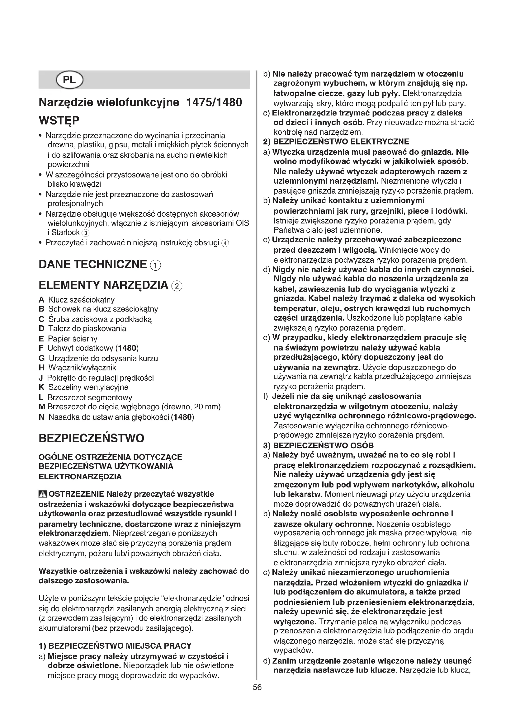 A Klucz sześciokątny B Schowek na klucz sześciokątny C Śruba zaciskowa z podkładką D Talerz do piaskowania E Papier ścierny F Uchwyt dodatkowy (1480) G Urządzenie do odsysania kurzu H Włącznik/wyłącznik J Pokrętło do regulacji prędkości K Szczeliny wentylacyjne L Brzeszczot segmentowy M Brzeszczot do cięcia wgłębnego (drewno, 20 mm) N Nasadka do ustawiania głębokości (1480) BEZPIECZEŃSTWO