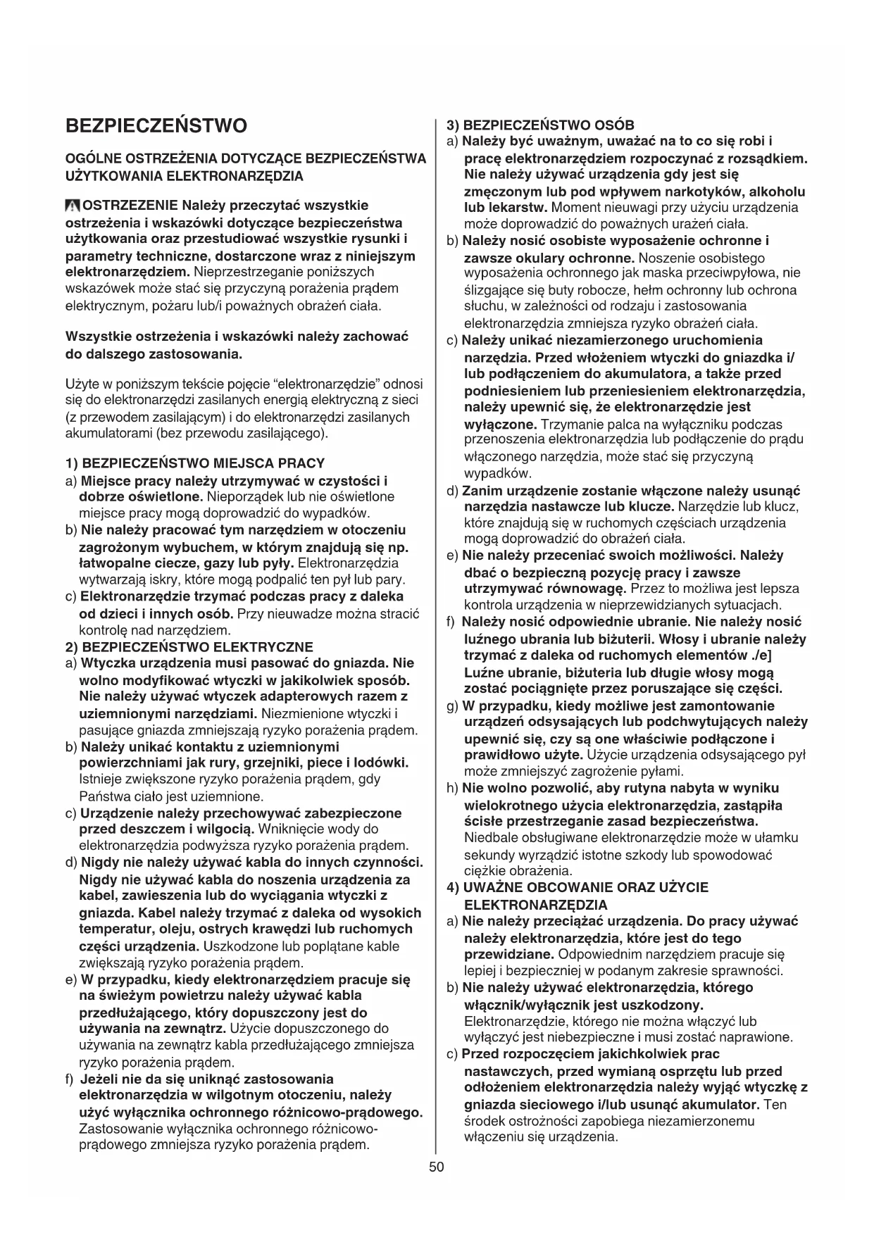 OSTRZEZENIE Należy przeczytać wszystkie ostrzeżenia i wskazówki dotyczące bezpieczeństwa użytkowania oraz przestudiować wszystkie rysunki i parametry techniczne, dostarczone wraz z niniejszym elektronarzędziem. Nieprzestrzeganie poniższych wskazówek może stać się przyczyną porażenia prądem elektrycznym, pożaru lub/i poważnych obrażeń ciała. Wszystkie ostrzeżenia i wskazówki należy zachować do dalszego zastosowania. Użyte w poniższym tekście pojęcie “elektronarzędzie” odnosi się do elektronarzędzi zasilanych energią elektryczną z sieci (z przewodem zasilającym) i do elektronarzędzi zasilanych akumulatorami (bez przewodu zasilającego).