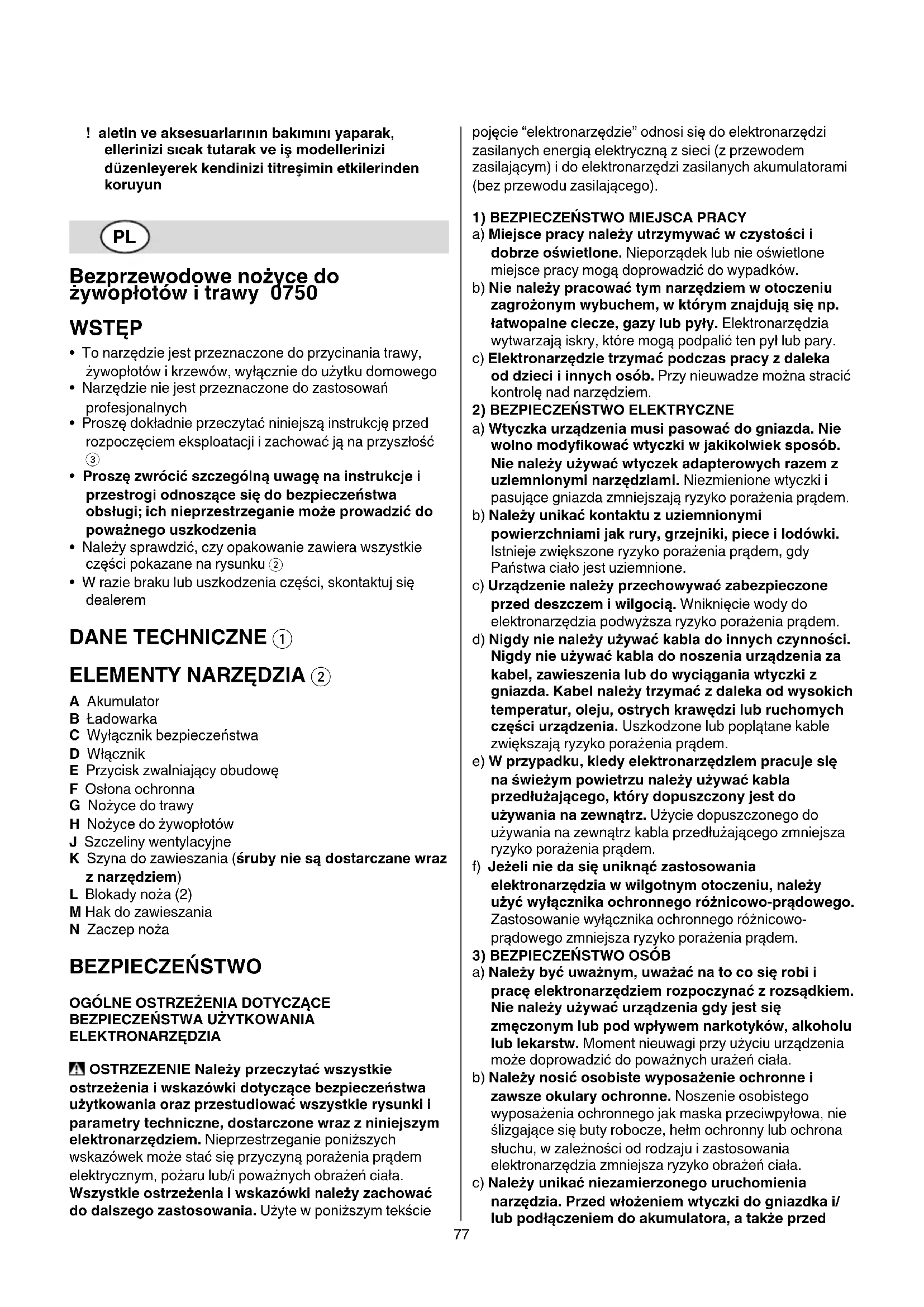 A Akumulator B Ładowarka C Wyłącznik bezpieczeństwa D Włącznik E Przycisk zwalniający obudowę F Osłona ochronna G Nożyce do trawy H Nożyce do żywopłotów J Szczeliny wentylacyjne K Szyna do zawieszania (śruby nie są dostarczane wraz z narzędziem) L Blokady noża (2) M Hak do zawieszania N Zaczep noża BEZPIECZEŃSTWO