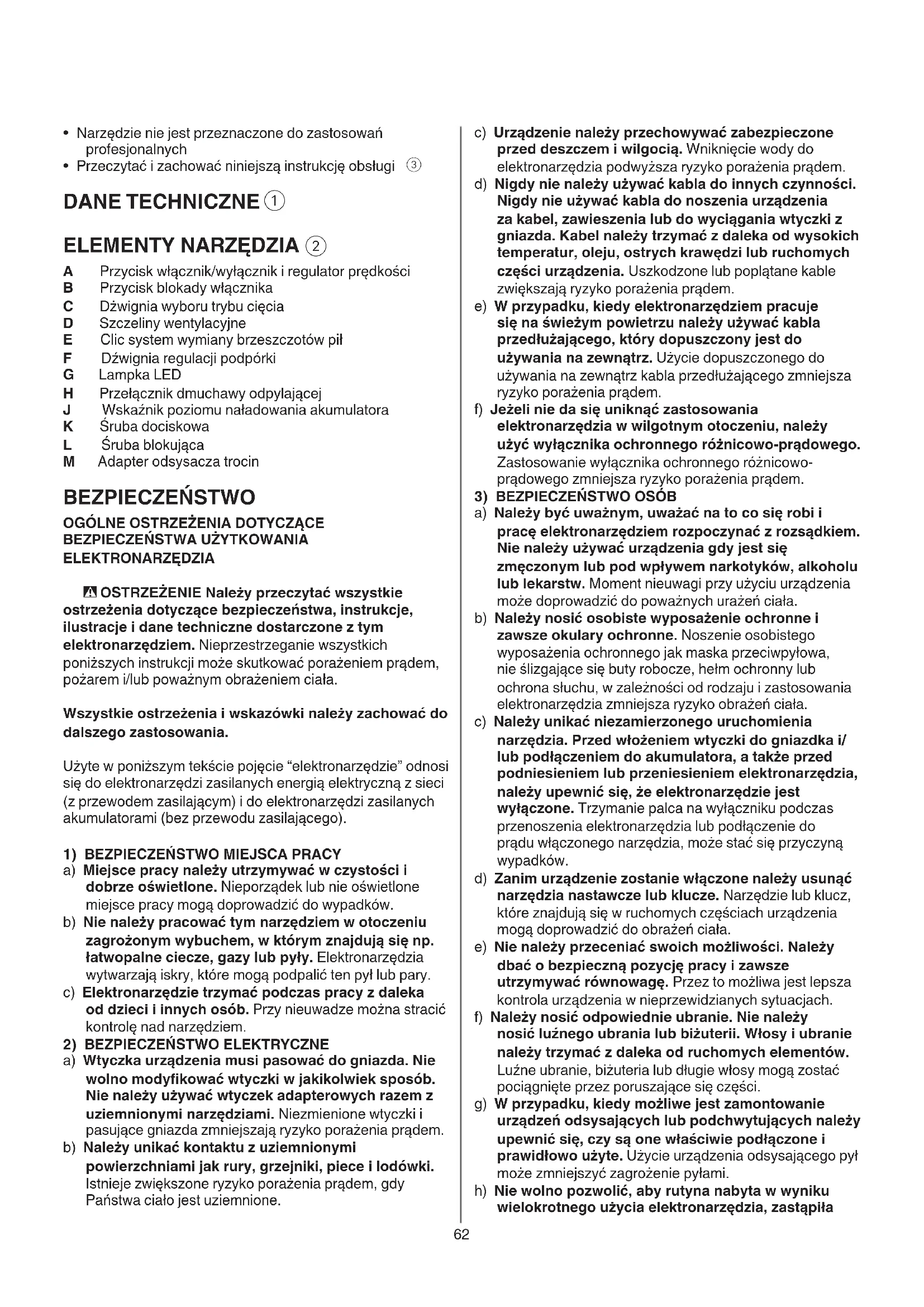 A Przycisk włącznik/wyłącznik i regulator prędkości B Przycisk blokady włącznika C Dżwignia wyboru trybu cięcia D Szczeliny wentylacyjne E Clic system wymiany brzeszczotów pił F Dźwignia regulacji podpórki G Lampka LED H Przełącznik dmuchawy odpylającej J Wskaźnik poziomu naładowania akumulatora K Śruba dociskowa L Śruba blokująca M Adapter odsysacza trocin BEZPIECZEŃSTWO