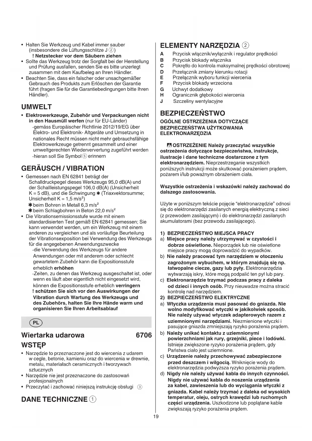 a) Podczas wiercenia udarowego zakładać ochronniki słuchu. Narażenie na hałas może doprowadzić do utraty słuchu. b) Użyć uchwytu dodatkowego. Utrata kontroli może spowodować uszkodzenia ciała. c) Podczas wykonywania prac, przy których narzędzia robocze lub śruby mogłyby natrać na ukryte przewody elektryczne lub własny przewód, elektronarzędzia należy trzymać za izolowaną powierzchnię uchwytu. Zetknięcie się narzędzia lub śruby z przewodem pod napięciem może spowodować przepływ prądu przez metalowe części elektronarzędzia i porażenie operatora. e) W przypadku, kiedy elektronarzędziem pracuje się na świeżym powietrzu należy używać kabla przedłużającego, który dopuszczony jest do używania na zewnątrz. Użycie dopuszczonego do używania na zewnątrz kabla przedłużającego zmniejsza ryzyko porażenia prądem. f) Jeżeli nie da się uniknąć zastosowania elektronarzędzia w wilgotnym otoczeniu, należy użyć wyłącznika ochronnego różnicowo-prądowego. Zastosowanie wyłącznika ochronnego różnicowo- prądowego zmniejsza ryzyko porażenia prądem.