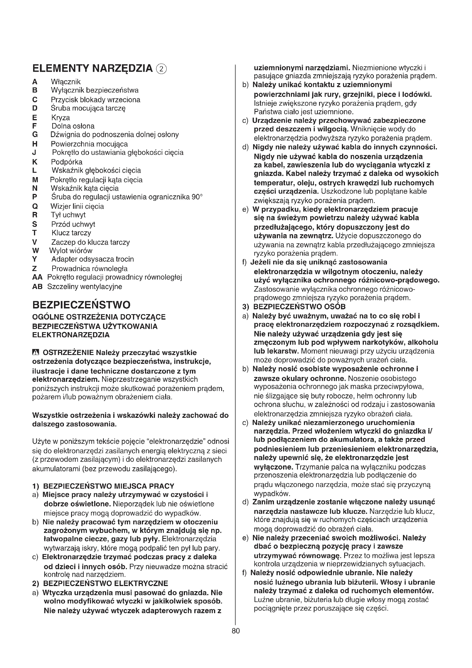 A Włącznik B Wyłącznik bezpieczeństwa C Przycisk blokady wrzeciona D Śruba mocująca tarczę E Kryza F Dolna osłona G Dźwignia do podnoszenia dolnej osłony H Powierzchnia mocująca J Pokrętło do ustawiania głębokości cięcia K Podpórka L Wskaźnik głębokości cięcia M Pokrętło regulacji kąta cięcia N Wskaźnik kąta cięcia P Śruba do regulacji ustawienia ogranicznika 90° Q Wizjer linii cięcia R Tył uchwyt S Przód uchwyt T Klucz tarczy V Zaczep do klucza tarczy W Wylot wiórów Y Adapter odsysacza trocin Z Prowadnica równoległa AA Pokrętło regulacji prowadnicy równoległej AB Szczeliny wentylacyjne BEZPIECZEŃSTWO