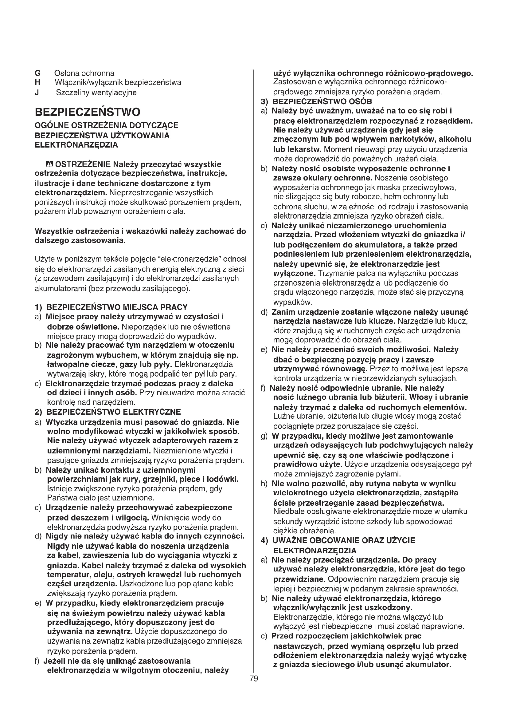 ELEKTRONARZĘDZIA a) Nie należy przeciążać urządzenia. Do pracy używać należy elektronarzędzia, które jest do tego przewidziane. Odpowiednim narzędziem pracuje się lepiej i bezpieczniej w podanym zakresie sprawności. b) Nie należy używać elektronarzędzia, którego włącznik/wyłącznik jest uszkodzony. Elektronarzędzie, którego nie można włączyć lub wyłączyć jest niebezpieczne i musi zostać naprawione. c) Przed rozpoczęciem jakichkolwiek prac nastawczych, przed wymianą osprzętu lub przed odłożeniem elektronarzędzia należy wyjąć wtyczkę z gniazda sieciowego i/lub usunąć akumulator. G Osłona ochronna H Włącznik/wyłącznik bezpieczeństwa J Szczeliny wentylacyjne BEZPIECZEŃSTWO