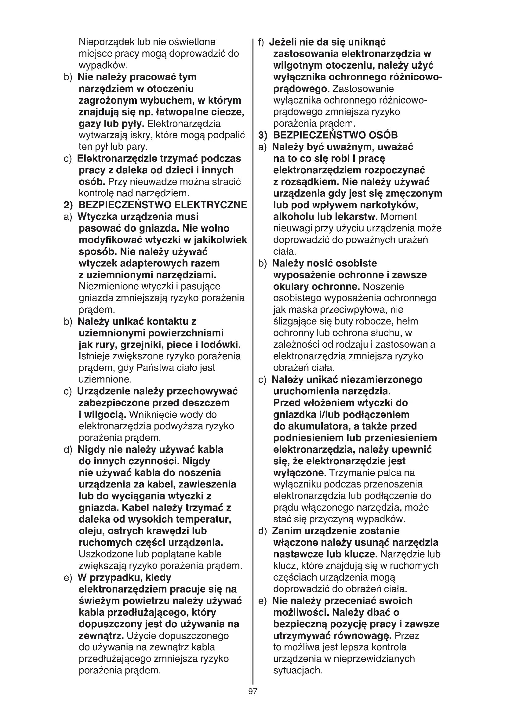 - Narzędzie nie jest przeznaczone do97 f) Jeżeli nie da się uniknąć zastosowania elektronarzędzia w wilgotnym otoczeniu, należy użyć wyłącznika ochronnego różnicowo- prądowego. Zastosowanie wyłącznika ochronnego różnicowo- prądowego zmniejsza ryzyko porażenia prądem.