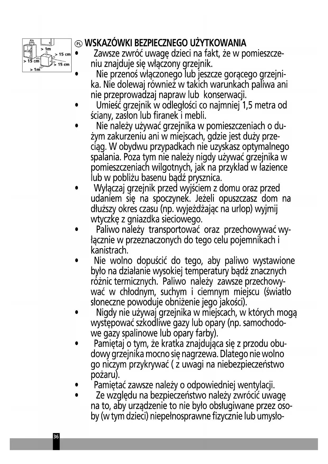 - Nie należy używać grzejnika w pomieszczeniach o du- żym zakurzeniu ani w miejscach, gdzie jest duży prze- ciąg. W obydwu przypadkach nie uzyskasz optymalnego spalania. Poza tym nie należy nigdy używać grzejnika w pomieszczeniach wilgotnych, jak na przykład w łazience lub w pobliżu basenu bądź prysznica.