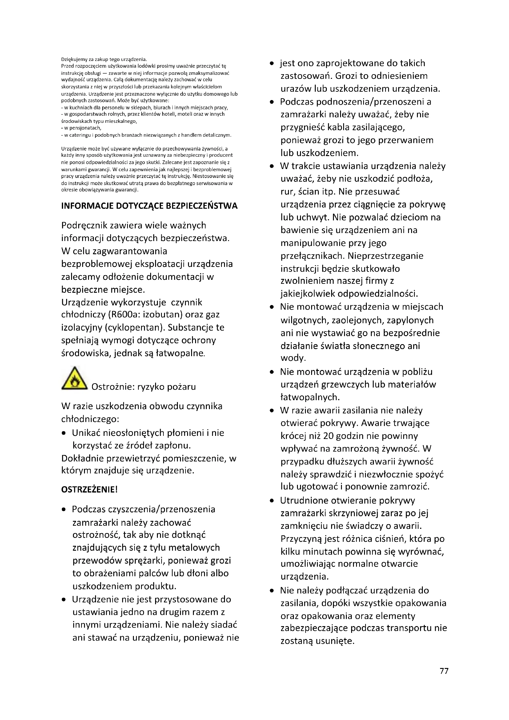 Podręcznik zawiera wiele ważnych informacji dotyczących bezpieczeństwa. W celu zagwarantowania bezproblemowej eksploatacji urządzenia zalecamy odłożenie dokumentacji w bezpieczne miejsce. Urządzenie wykorzystuje czynnik chłodniczy (R600a: izobutan) oraz gaz izolacyjny (cyklopentan). Substancje te spełniają wymogi dotyczące ochrony środowiska, jednak są łatwopalne. Ostrożnie: ryzyko pożaru W razie uszkodzenia obwodu czynnika chłodniczego: