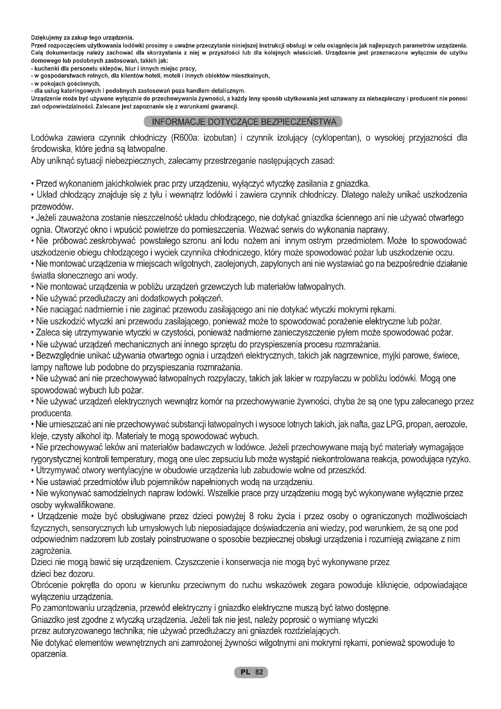 Dziękujemy za zakup tego urządzenia. Przed rozpoczęciem użytkowania lodówki prosimy o uważne przeczytanie niniejszej instrukcji obsługi w celu osiągnięcia jak najlepszych parametrów urządzenia. Całą dokumentację należy zachować dla skorzystania z niej w przyszłości lub dla kolejnych właścicieli. Urządzenie jest przeznaczone wyłącznie do użytku domowego lub podobnych zastosowań, takich jak: - kuchenki dla personelu sklepów, biur i innych miejsc pracy, - w gospodarstwach rolnych, dla klientów hoteli, moteli i innych obiektów mieszkalnych, - w pokojach gościnnych, - dla usług kateringowych i podobnych zastosowań poza handlem detalicznym. Urządzenie może być używane wyłącznie do przechowywania żywności, a każdy inny sposób użytkowania jest uznawany za niebezpieczny i producent nie ponosi zań odpowiedzialności. Zalecane jest zapoznanie się z warunkami gwarancji. Lodówka zawiera czynnik chłodniczy (R600a: izobutan) i czynnik izolujący (cyklopentan), o wysokiej przyjazności dla środowiska, które jedna są łatwopalne. Aby uniknąć sytuacji niebezpiecznych, zalecamy przestrzeganie następujących zasad: