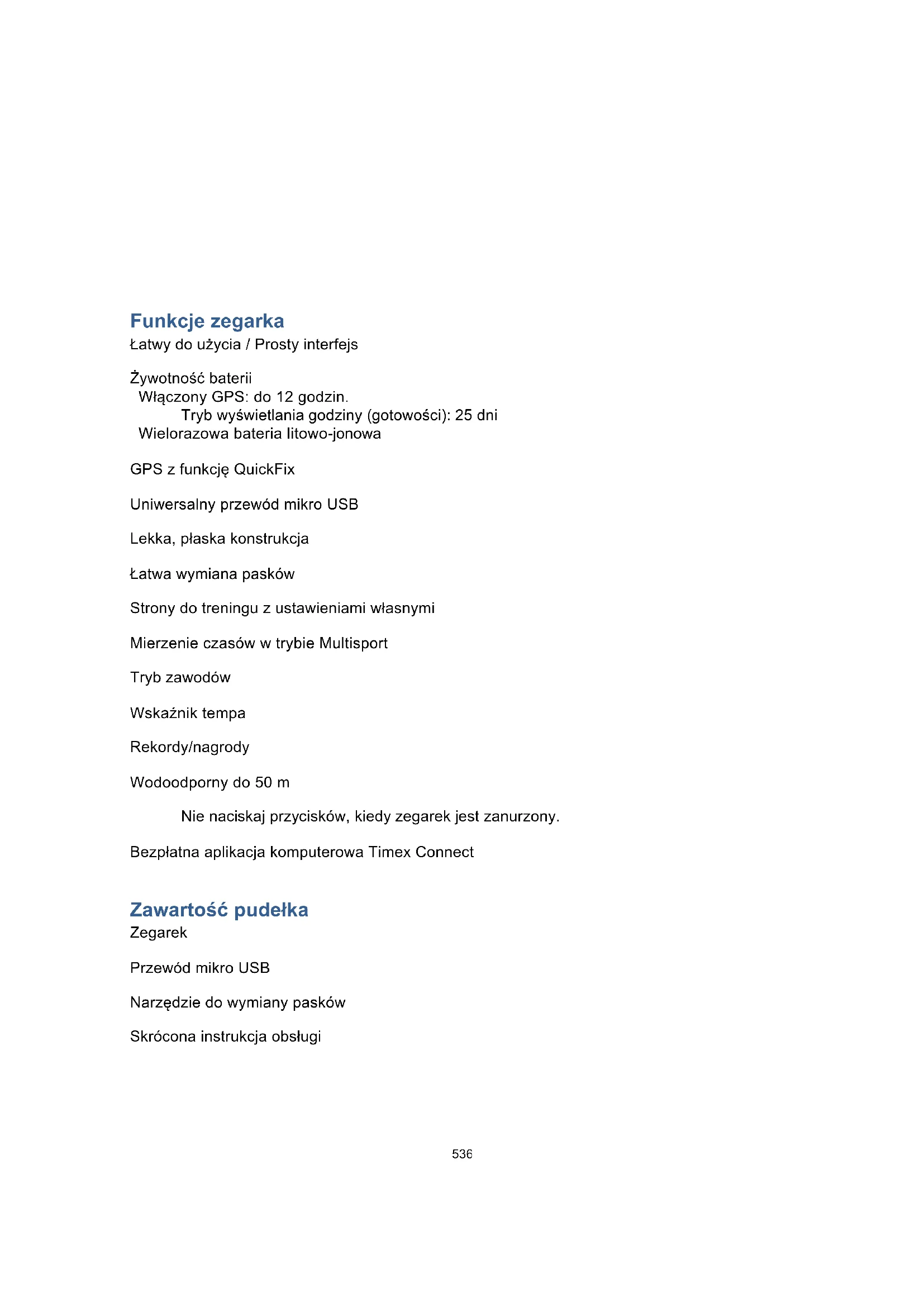 Funkcje zegarka Łatwy do użycia / Prosty interfejs Żywotność baterii Włączony GPS: do 12 godzin. Tryb wyświetlania godziny (gotowości): 25 dni Wielorazowa bateria litowo-jonowa GPS z funkcję QuickFix Uniwersalny przewód mikro USB Lekka, płaska konstrukcja Łatwa wymiana pasków Strony do treningu z ustawieniami własnymi Mierzenie czasów w trybie Multisport Tryb zawodów Wskaźnik tempa Rekordy/nagrody Wodoodporny do 50 m Nie naciskaj przycisków, kiedy zegarek jest zanurzony. Bezpłatna aplikacja komputerowa Timex Connect Zawartość pudełka Zegarek Przewód mikro USB Narzędzie do wymiany pasków Skrócona instrukcja obsługi537 Na początek Ten podręcznik właściciela wyjaśni wszystkie funkcje nowego zegarka, TIMEX