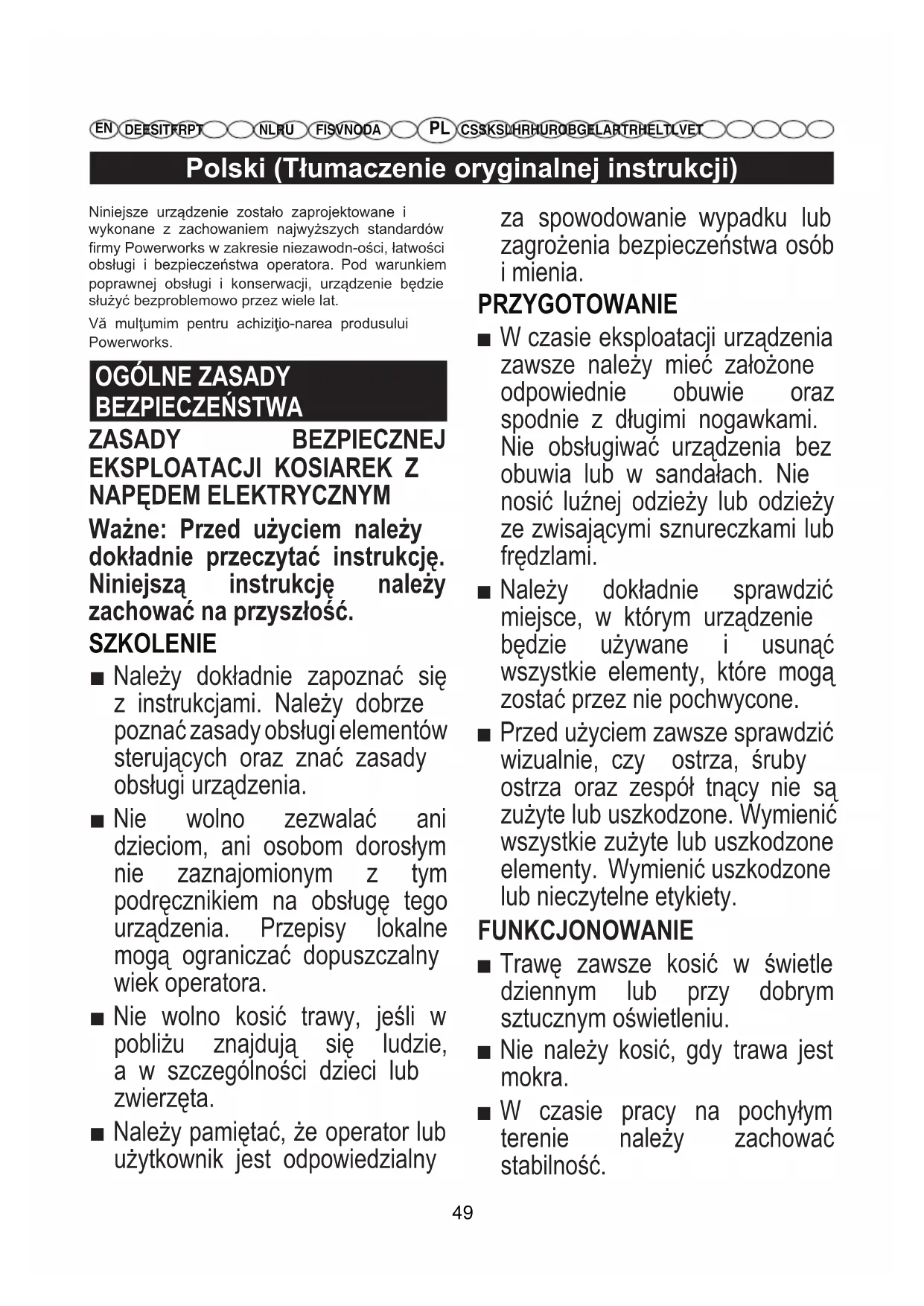 Ważne: Przed użyciem należy dokładnie przeczytać instrukcję. Niniejszą instrukcję należy zachować na przyszłość. SZKOLENIE ■ Należy dokładnie zapoznać się z instrukcjami. Należy dobrze poznać zasady obsługi elementów sterujących oraz znać zasady obsługi urządzenia. ■ Nie wolno zezwalać ani dzieciom, ani osobom dorosłym nie zaznajomionym z tym podręcznikiem na obsługę tego urządzenia. Przepisy lokalne mogą ograniczać dopuszczalny wiek operatora. ■ Nie wolno kosić trawy, jeśli w pobliżu znajdują się ludzie, a w szczególności dzieci lub zwierzęta. ■ Należy pamiętać, że operator lub użytkownik jest odpowiedzialny za spowodowanie wypadku lub zagrożenia bezpieczeństwa osób i mienia. PRZYGOTOWANIE ■ W czasie eksploatacji urządzenia zawsze należy mieć założone odpowiednie obuwie oraz spodnie z długimi nogawkami. Nie obsługiwać urządzenia bez obuwia lub w sandałach. Nie nosić luźnej odzieży lub odzieży ze zwisającymi sznureczkami lub frędzlami. ■ Należy dokładnie sprawdzić miejsce, w którym urządzenie będzie używane i usunąć wszystkie elementy, które mogą zostać przez nie pochwycone. ■ Przed użyciem zawsze sprawdzić wizualnie, czy ostrza, śruby ostrza oraz zespół tnący nie są zużyte lub uszkodzone. Wymienić wszystkie zużyte lub uszkodzone elementy. Wymienić uszkodzone lub nieczytelne etykiety. FUNKCJONOWANIE ■ Trawę zawsze kosić w świetle dziennym lub przy dobrym sztucznym oświetleniu. ■ Nie należy kosić, gdy trawa jest mokra. ■ W czasie pracy na pochyłym terenie należy zachować stabilność. 49Polski (Tłumaczenie oryginalnej instrukcji)