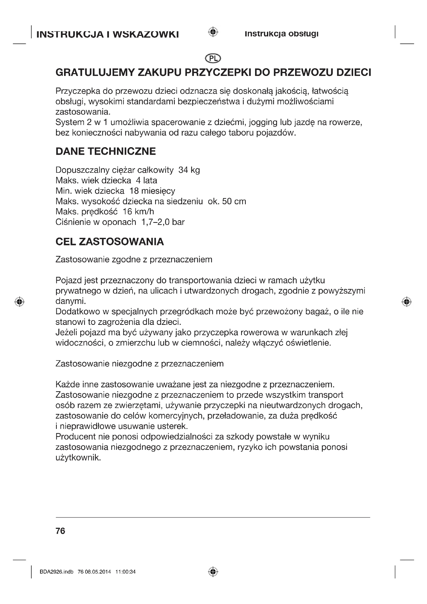 Przyczepka do przewozu dzieci odznacza się doskonałą jakością, łatwością obsługi, wysokimi standardami bezpieczeństwa idużymi możliwościami zastosowania. System 2 w1 umożliwia spacerowanie zdziećmi, jogging lub jazdę na rowerze, bez konieczności nabywania od razu całego taboru pojazdów. DANE TECHNICZNE Dopuszczalny ciężar całkowity 34kg Maks. wiek dziecka 4lata Min. wiek dziecka 18miesięcy Maks. wysokość dziecka na siedzeniu ok. 50cm Maks. prędkość 16km/h Ciśnienie woponach 1,7–2,0bar CEL ZASTOSOWANIA Zastosowanie zgodne zprzeznaczeniem Pojazd jest przeznaczony do transportowania dzieci wramach użytku prywatnego wdzień, na ulicach iutwardzonych drogach, zgodnie zpowyższymi danymi. Dodatkowo wspecjalnych przegródkach może być przewożony bagaż, oile nie stanowi to zagrożenia dla dzieci. Jeżeli pojazd ma być używany jako przyczepka rowerowa wwarunkach złej widoczności, ozmierzchu lub wciemności, należy włączyć oświetlenie. Zastosowanie niezgodne zprzeznaczeniem Każde inne zastosowanie uważane jest za niezgodne zprzeznaczeniem. Zastosowanie niezgodne zprzeznaczeniem to przede wszystkim transport osób razem ze zwierzętami, używanie przyczepki na nieutwardzonych drogach, zastosowanie do celów komercyjnych, przeładowanie, za duża prędkość inieprawidłowe usuwanie usterek. Producent nie ponosi odpowiedzialności za szkody powstałe wwyniku zastosowania niezgodnego zprzeznaczeniem, ryzyko ich powstania ponosi użytkownik.