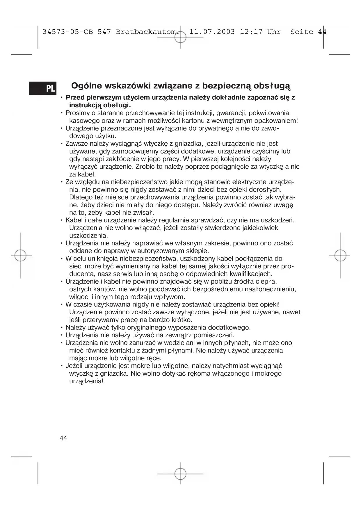 34573-05-CB 547 Brotbackautom. 11.07.2003 12:17 Uhr Seite 44Specjalne wskazówki związane z bezpieczną obsługą tego urządzenia