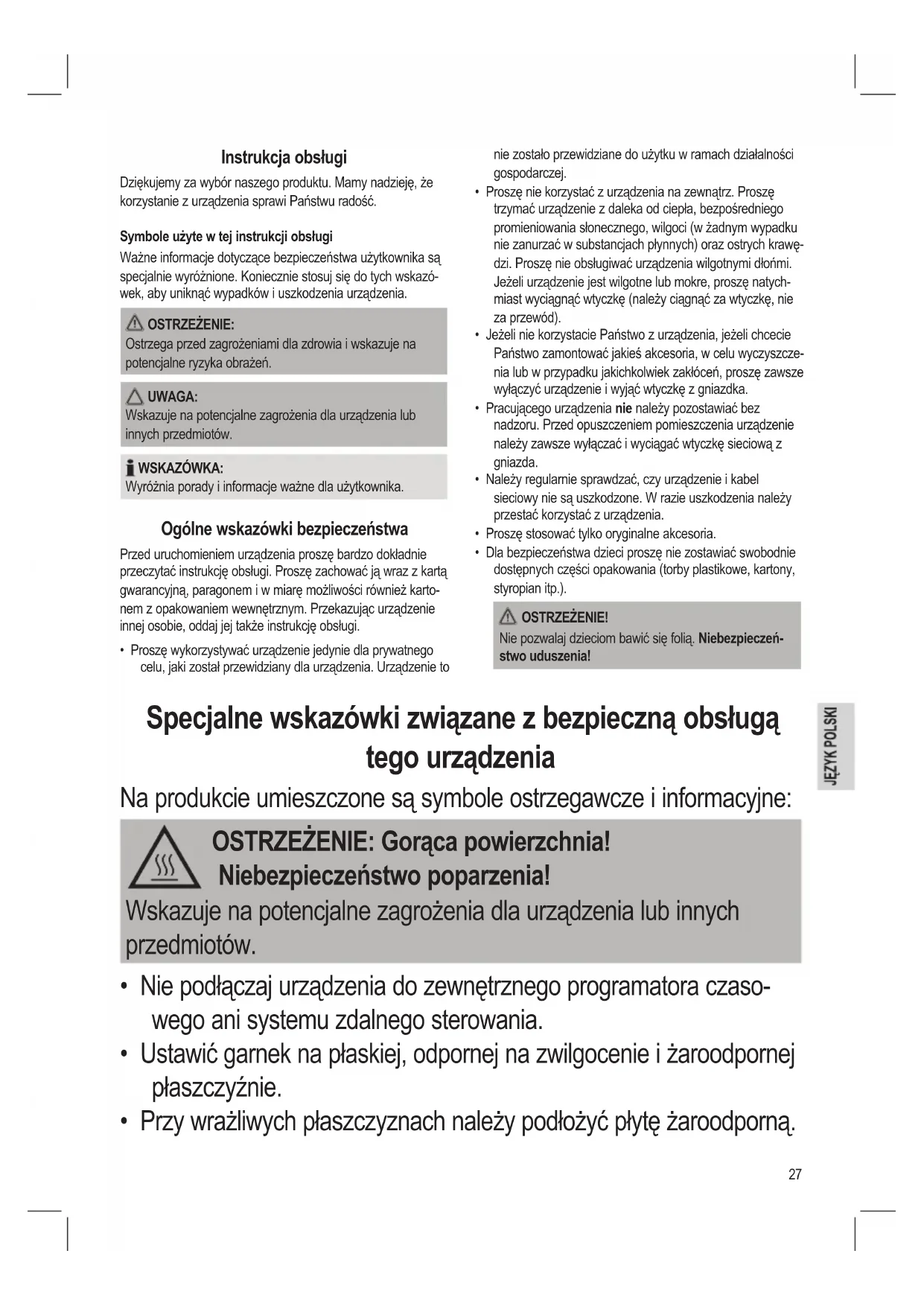 - Always store the appliance in a well-ventilated and dry place out of reach of children. Technical Data Model: ................................................................... EKP 5027 CB Power supply: ...................................................... .230 V~, 50 Hz Power consumption: .........................................................1500 W Protection class: ........................................................................... Ι Net weight: ..............................................................approx. 1.2 kg The right to make technical and design modications in the course of continuous product development remains reserved. This device has been tested according to all relevant current CE guidelines, such as electromagnetic compatibility and low voltage directives, and has been constructed in accordance with the latest safety regulations.27 Instrukcja obsługi Dziękujemy za wybór naszego produktu. Mamy nadzieję, że korzystanie z urządzenia sprawi Państwu radość. Symbole użyte w tej instrukcji obsługi Ważne informacje dotyczące bezpieczeństwa użytkownika są specjalnie wyróżnione. Koniecznie stosuj się do tych wskazó- wek, aby uniknąć wypadków i uszkodzenia urządzenia. OSTRZEŻENIE: Ostrzega przed zagrożeniami dla zdrowia i wskazuje na potencjalne ryzyka obrażeń. UWAGA: Wskazuje na potencjalne zagrożenia dla urządzenia lub innych przedmiotów. WSKAZÓWKA: Wyróżnia porady i informacje ważne dla użytkownika. Ogólne wskazówki bezpieczeństwa Przed uruchomieniem urządzenia proszę bardzo dokładnie przeczytać instrukcję obsługi. Proszę zachować ją wraz z kartą gwarancyjną, paragonem i w miarę możliwości również karto- nem z opakowaniem wewnętrznym. Przekazując urządzenie innej osobie, oddaj jej także instrukcję obsługi.
