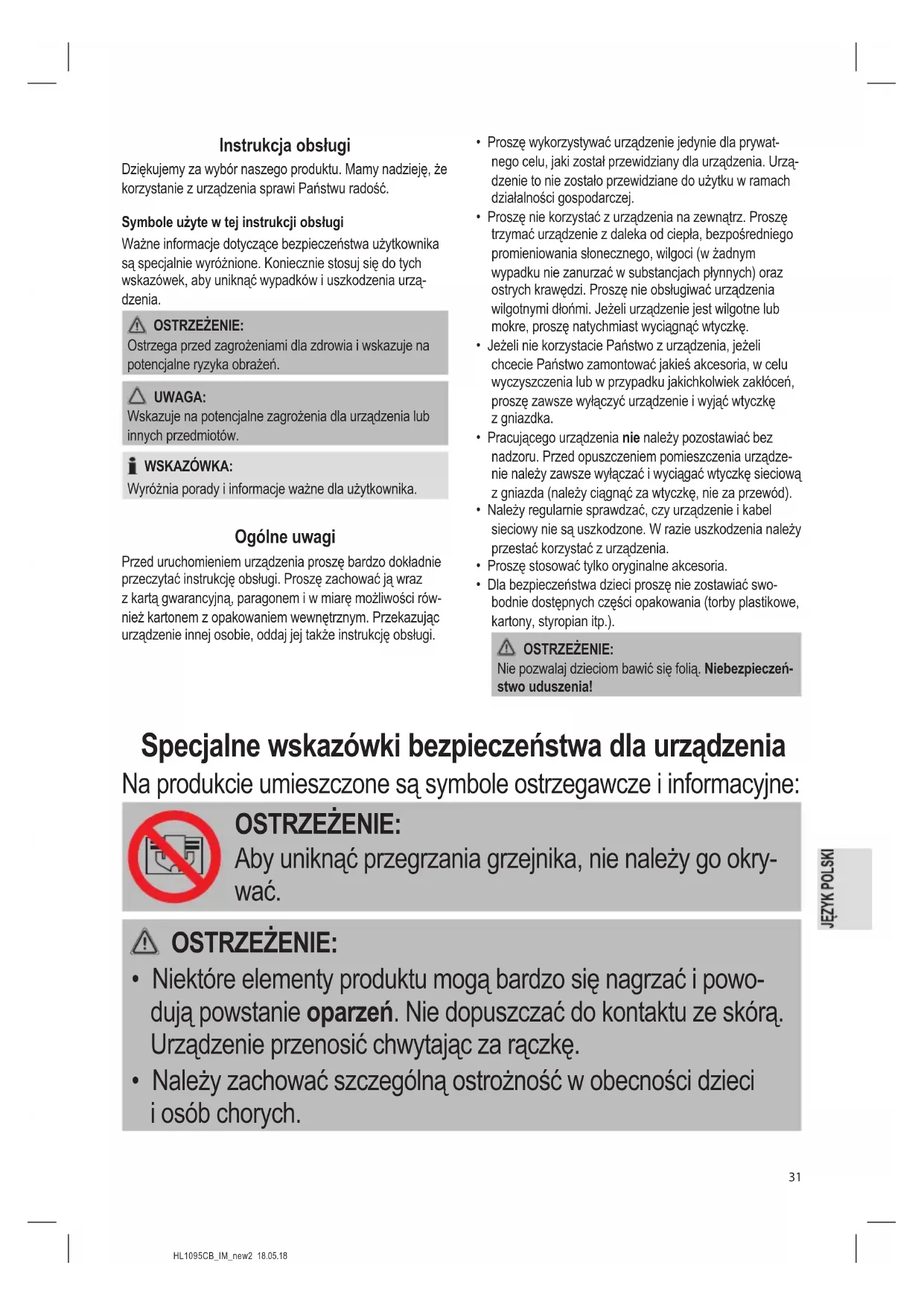 - Nie korzystać z urządzenia grzewczego na wolnym powietrzu.HL1095CB_IM_new2 18.05.18