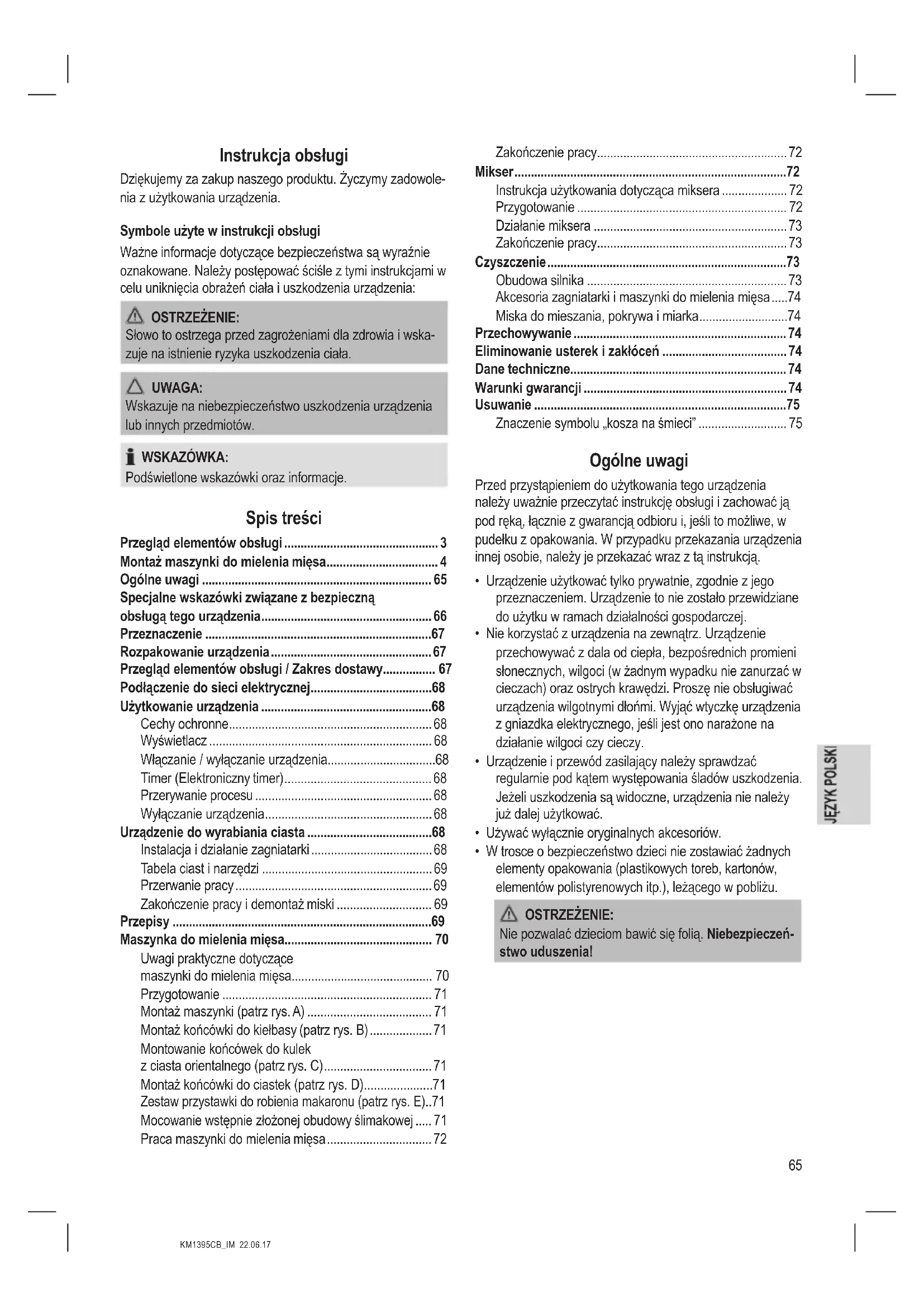 - the swivel arm (7) - the mixing vessel (5) and - the lid on the mixing vessel or - the safety cover (6) The appliance is defect. Consult our service de- partment or an expert. Technical Data Model:................................................................... KM 1395 CB Power supply:............................................. 220 - 240 V~, 50 Hz Power consumption: .....................................................1200 W Protection class: ...................................................................... Net weight: ..........................................................approx. 5,3 kg The right to make technical and design modications in the course of continuous product development remains reserved. This appliance has been tested according to all relevant current CE guidelines, such as electromagnetic compatibility and low voltage directives, and has been constructed in accordance with the latest safety regulations. Disposal Meaning of the Symbol “Dustbin” Protect our environment; electrical appliances do not belong in household waste. Use the collection points for the disposal of elec- trical equipment and submit your electrical and electronic equipment to these points that you will no longer use. You help reduce the potential impact of incorrect disposal on the environment and human health. You contribute to recycling, and other forms of recycling of electrical and electronic equipment. Information concerning the disposal of appliances can be obtained from your local or municipal authorities.65 KM1395CB_IM 22.06.17 Instrukcja obsługi Dziękujemy za zakup naszego produktu. Życzymy zadowole- nia z użytkowania urządzenia. Symbole użyte w instrukcji obsługi Ważne informacje dotyczące bezpieczeństwa są wyraźnie oznakowane. Należy postępować ściśle z tymi instrukcjami w celu uniknięcia obrażeń ciała i uszkodzenia urządzenia: OSTRZEŻENIE: Słowo to ostrzega przed zagrożeniami dla zdrowia i wska- zuje na istnienie ryzyka uszkodzenia ciała. UWAGA: Wskazuje na niebezpieczeństwo uszkodzenia urządzenia lub innych przedmiotów. WSKAZÓWKA: Podświetlone wskazówki oraz informacje. Spis treści Przegląd elementów obsługi ............................................... 3 Montaż maszynki do mielenia mięsa .................................. 4 Ogólne uwagi ......................................................................65 Specjalne wskazówki związane z bezpieczną obsługą tego urządzenia ....................................................66 Przeznaczenie .....................................................................67 Rozpakowanie urządzenia ................................................. 67 Przegląd elementów obsługi / Zakres dostawy................ 67 Podłączenie do sieci elektrycznej .....................................68 Użytkowanie urządzenia ....................................................68 Cechy ochronne ..............................................................68 Wyświetlacz .................................................................... 68 Włączanie / wyłączanie urządzenia.................................68 Timer (Elektroniczny timer) ............................................. 68 Przerywanie procesu ...................................................... 68 Wyłączanie urządzenia ...................................................68 Urządzenie do wyrabiania ciasta ......................................68 Instalacja i działanie zagniatarki ..................................... 68 Tabela ciast i narzędzi ....................................................69 Przerwanie pracy ............................................................ 69 Zakończenie pracy i demontaż miski ............................. 69 Przepisy ...............................................................................69 Maszynka do mielenia mięsa............................................. 70 Uwagi praktyczne dotyczące maszynki do mielenia mięsa........................................... 70 Przygotowanie ................................................................ 71 Montaż maszynki (patrz rys. A) ...................................... 71 Montaż końcówki do kiełbasy (patrz rys. B) ................... 71 Montowanie końcówek do kulek z ciasta orientalnego (patrz rys. C) .................................71 Montaż końcówki do ciastek (patrz rys. D) .....................71 Zestaw przystawki do robienia makaronu (patrz rys. E)