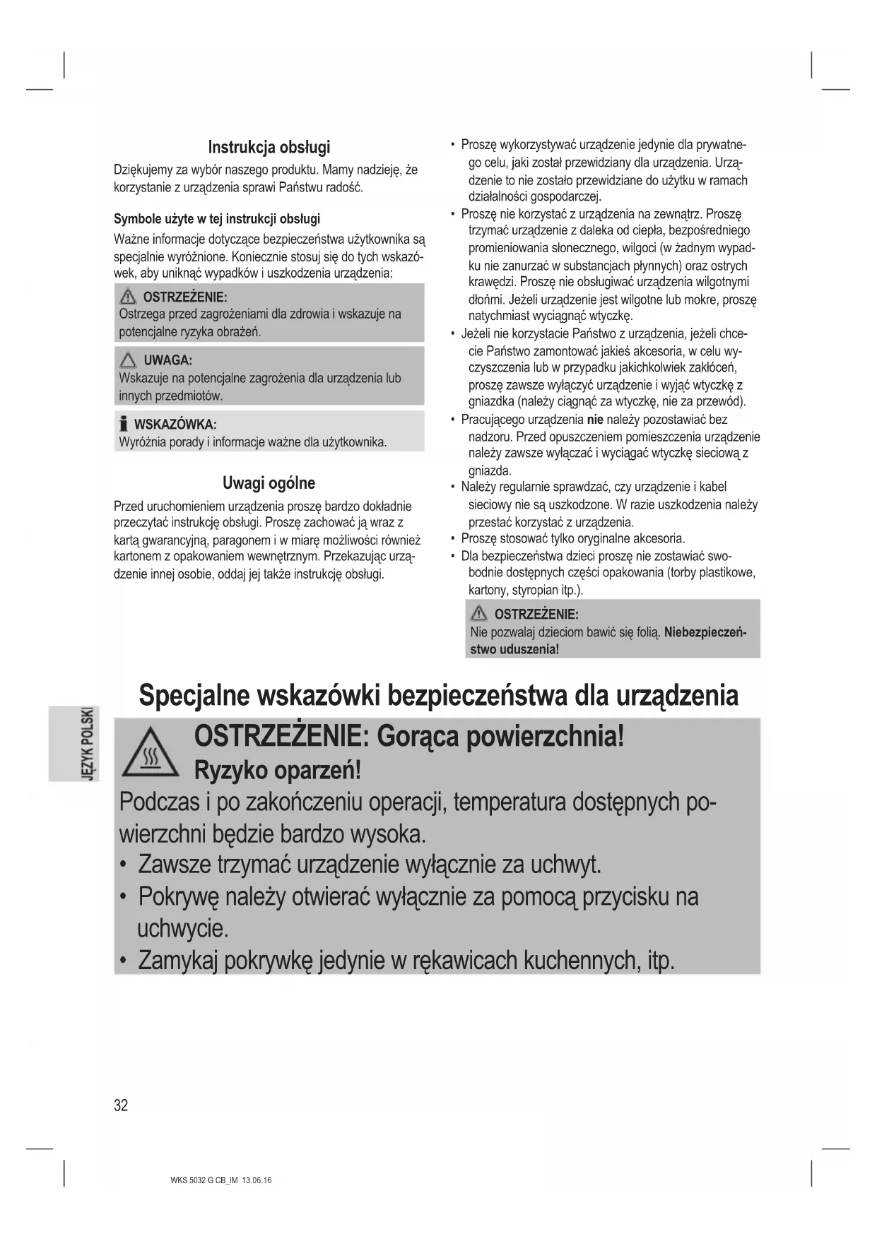 Przed uruchomieniem urzadzenia prosze bardzo dokladnie przechytać instrukcje obstugi. Prosze zachować ja wraz z karta gwarancyjna, paragonem i w miare moziwość rownie z kartonem z opakowaniem wewnetrznym. Przekazuju uzadzenia内在ej osobie, oddaj jej takze instrukcje obstugi.