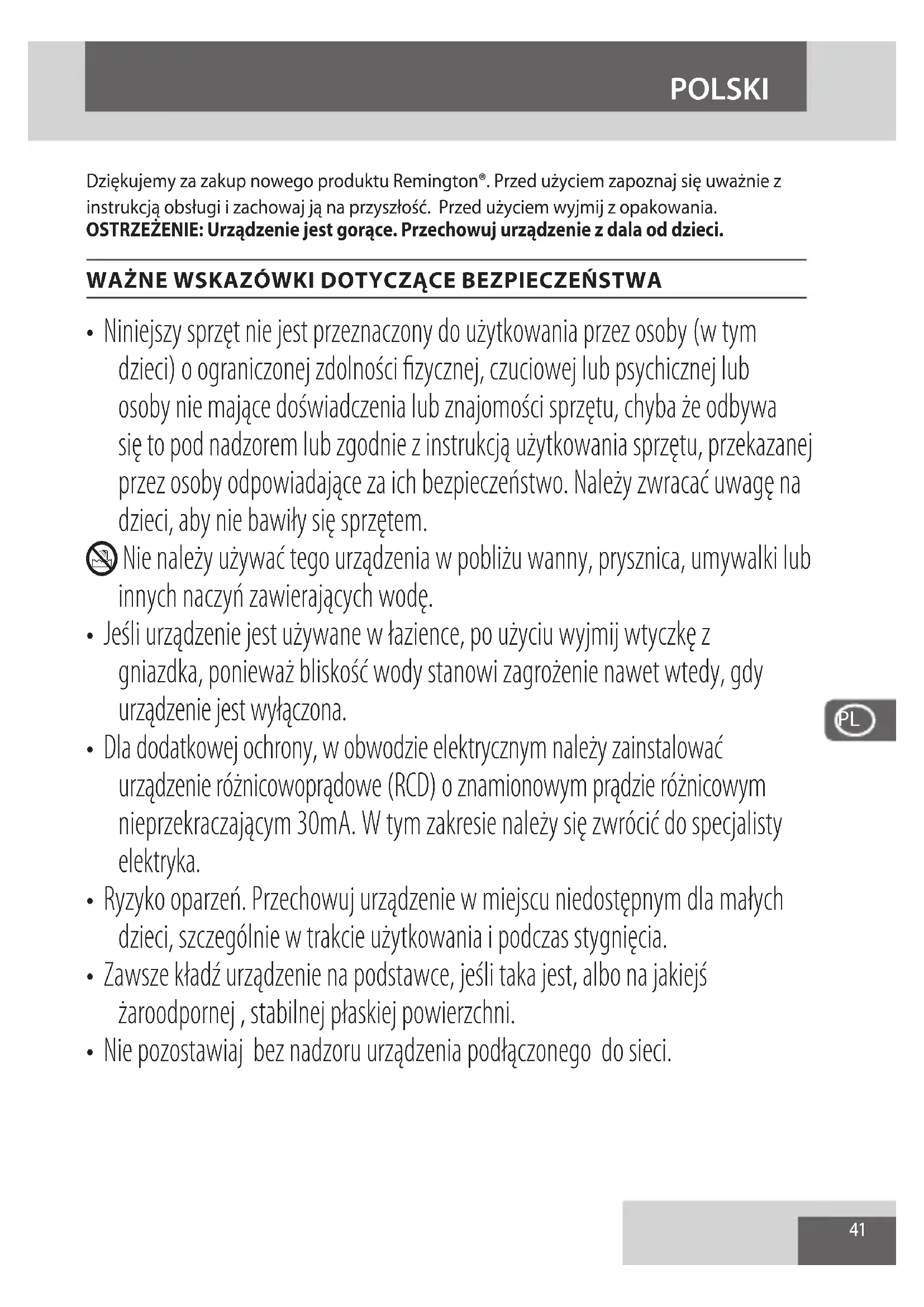 - Jeżeli przewód zasilający urządzenia ulegnie uszkodzeniu, natychmiast przestań wykorzystywać urządzenie i zwróć urządzenie do najbliższego autoryzowanego punktu serwisowego Remington ® w celu naprawy lub wymiany dla uniknięcia zagrożenia.