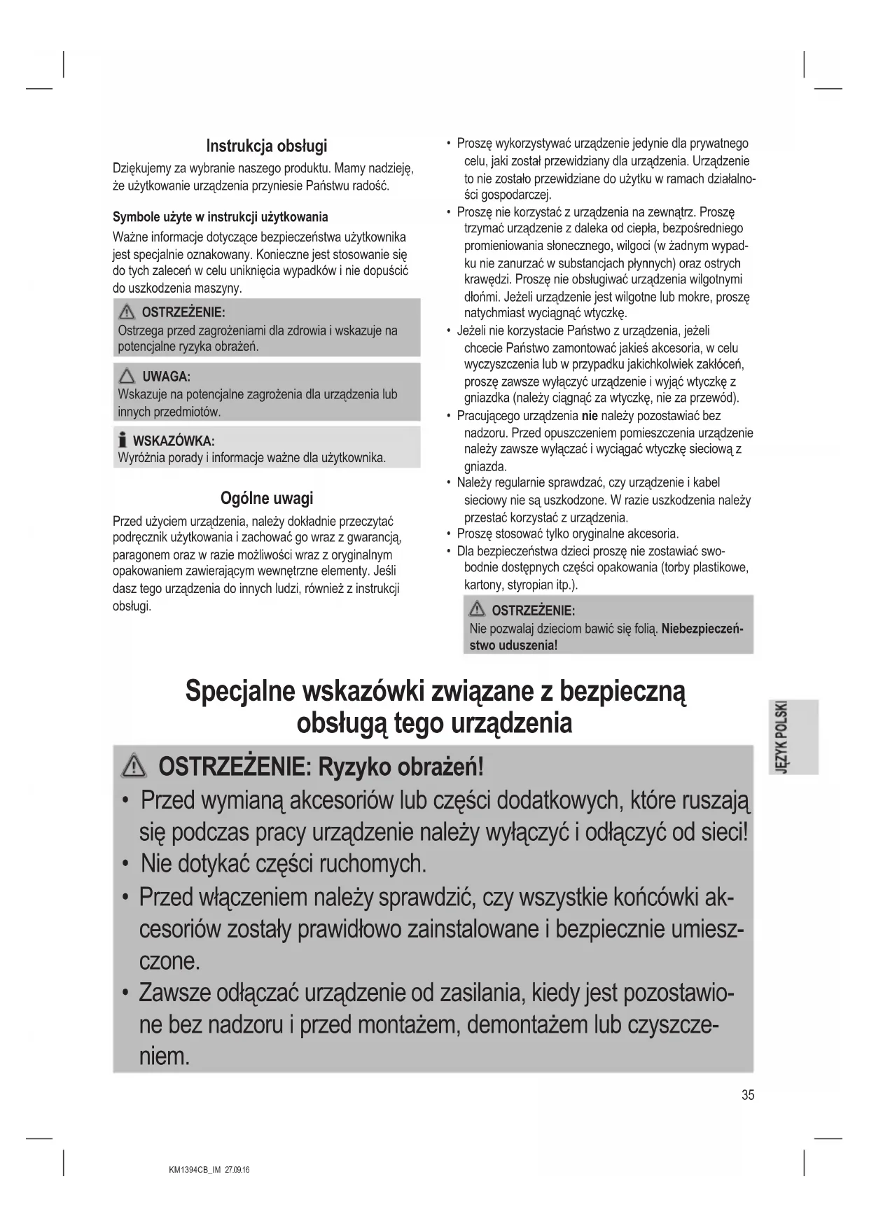 - Zawsze odłączać urządzenie od zasilania, kiedy jest pozostawio- ne bez nadzoru i przed montażem, demontażem lub czyszcze- niem.36 KM1394CB_IM 27.09.16 OSTRZEŻENIE: Ryzyko obrażeń!
