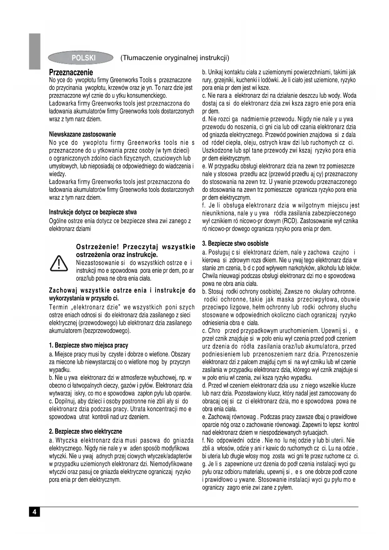 Ostrzeżenie! Aby ograniczyć ryzyko obrażeń ciała, użytkownik musi przeczytać instrukcję obsługi. Nie narażaj elektronarzędzi na działanie deszczu lub nadmiernej wilgoci. Noś obuwie antypoślizgowe. Ostrzeżenie! Nie dotykaj łańcucha w miejscu wyrzutu wiórów. Zawsze stosuj środki ochrony uszu i oczu. Aby zapewnić nieustanną bezpieczną obsługę, należy sprawdzać naciąg łańcucha zgodnie z instrukcją podaną w tym podręczniku co 10 minut pracy i wyregulować w taki sposób, aby zapewnić 3 mm luzu, jeśli jest to wymagane. Uważaj na spadające obiekty. Nie dopuść, aby osoby postronne znajdowały się w pobliżu. Ryzyko śmiertelnego porażenia prądem. Zachowaj dystans minimum 10 m od linii napowietrznych. (Tłumaczenie oryginalnej instrukcji) POLSKI8 Ładowarki Ostrzeżenie! Ładowarka jest przeznaczona do pracy przy określonym napięciu. Zawsze należy sprawdzać, czy napięcie źródła zasilania odpowiada napięciu podanemu na tabliczce znamionowej. Ostrzeżenie! Nigdy nie wolno zastępować ładowarki zwykłą wtyczką sieciową. ● Ładowarki Greenworkstools należy używać wyłącznie do ładowania akumulatora w urządzeniu/narzędziu, z którym ładowarka była dostarczona. Inne akumulatory mogą eksplodować, powodując obrażenia ciała oraz uszkodzenia. ● Nigdy nie należy ładować baterii jednorazowego użytku. ● Jeśli przewód zasilający zostanie uszkodzony, musi on być wymieniony przez producenta lub autoryzowany punkt serwisowy Greenworks w celu wyeliminowania zagrożenia. ● Nie narażaj akumulatora na kontakt z wodą. ● Nie otwieraj ładowarki. ● Nie zwieraj styków ładowarki. ● Ładowarka podczas ładowania musi być umieszczona w dobrze wentylowanym miejscu. Symbole na ładowarce Na ładowarce znajdują się następujące symbole: Siden din lader er dobbeltisolert er det ikke nødvendig med jording. Kontroller alltid at spenningen i strømnettet stemmer med spenningen på laderens identifikasjonsplate. Gjør aldri forsøk på å erstatte laderen med en vanlig strømkontakt. Hvis ledningen er skadet må den skiftes av produsenten eller en autorisert Greenworkstools servicerepresentant for å unngå faresituasjoner. Denne laderen er kun ment for innendørs bruk. Les instruksjonsmanualen før bruk. Czci składowe