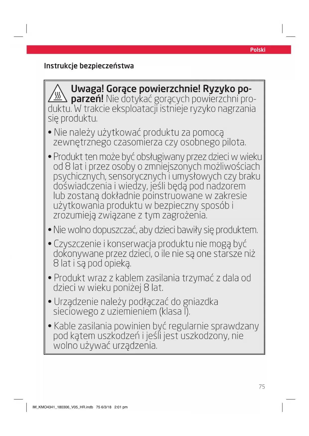 - Kable zasilania powinien być regularnie sprawdzany pod kątem uszkodzeń i jeśli jest uszkodzony, nie wolno używać urządzenia. IM_KMO4341_180306_V05_HR.indb 75 6/3/18 2:01 pmSize - A5 Polski