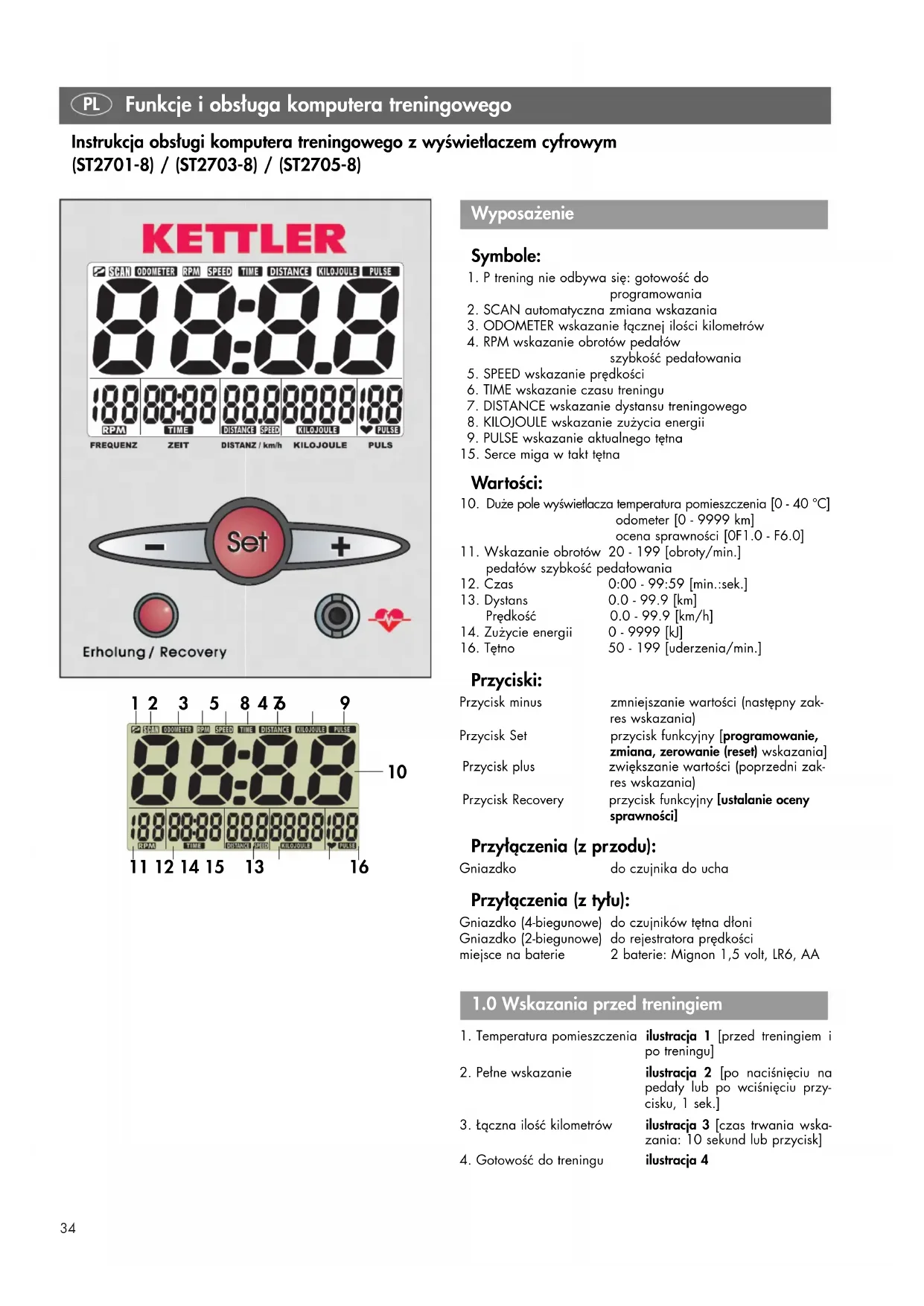 Przyciski: Przycisk minus zmniejszanie wartości (następny zak- res wskazania) Przycisk Set przycisk funkcyjny [programowanie, zmiana, zerowanie (reset) wskazania] Przycisk plus zwiększanie wartości (poprzedni zak- res wskazania) Przycisk Recovery przycisk funkcyjny [ustalanie oceny sprawności] Przyłączenia (z przodu): Gniazdko do czujnika do ucha Przyłączenia (z tyłu): Gniazdko (4-biegunowe) do czujników tętna dłoni Gniazdko (2-biegunowe) do rejestratora prędkości miejsce na baterie 2 baterie: Mignon 1,5 volt, LR6, AA