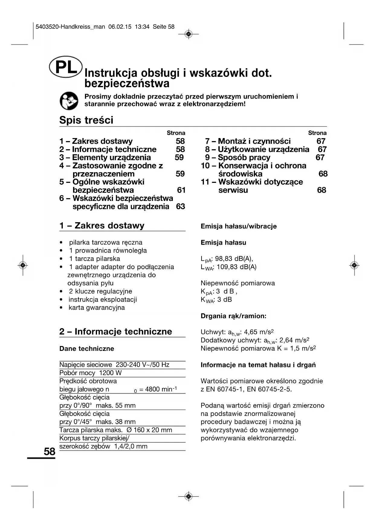 - pilarka tarczowa ręczna• 1 prowadnica równoległa• 1 tarcza pilarska• 1 adapter adapter do podłączeniazewnętrznego urządzenia doodsysania pyłu• 2 klucze regulacyjne• instrukcja eksploatacji• karta gwarancyjna 2 – Informacje techniczne Dane techniczneNapięcie sieciowe 230-240 V~/50 HzPobór mocy 1200 WPrędkość obrotowabiegu jałowego n = 4800 min Głębokość cięciaprzy 0°/90° maks. 55 mmGłębokość cięciaprzy 0°/45° maks. 38 mmTarcza pilarska maks. Ø 160 x 20 mmKorpus tarczy pilarskiej/szerokość zębów 1,4/2,0 mmEmisja hałasu/wibracjeEmisja hałasu