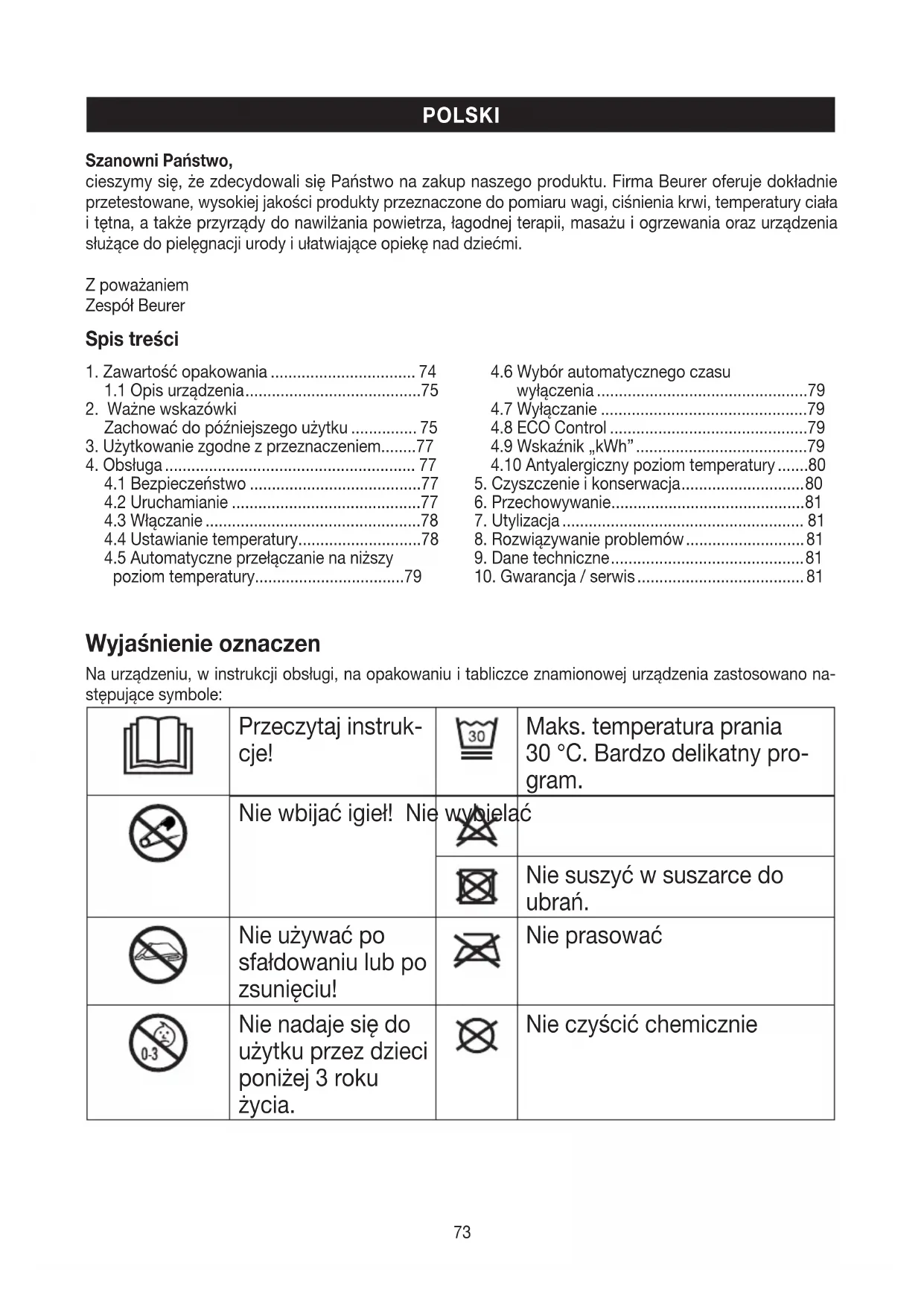 Szanowni Państwo, cieszymy się, że zdecydowali się Państwo na zakup naszego produktu. Firma Beurer oferuje dokładnie przetestowane, wysokiej jakości produkty przeznaczone do pomiaru wagi, ciśnienia krwi, temperatury ciała i tętna, a także przyrządy do nawilżania powietrza, łagodnej terapii, masażu i ogrzewania oraz urządzenia służące do pielęgnacji urody i ułatwiające opiekę nad dziećmi. Z poważaniem Zespół Beurer74