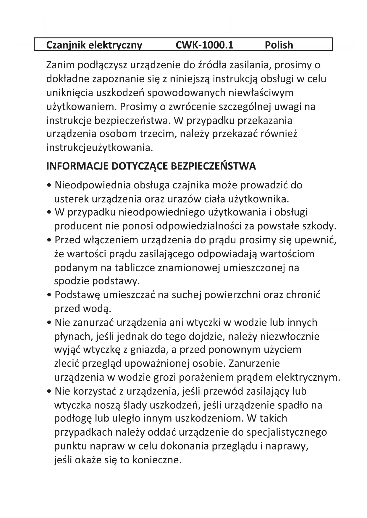 - Don’t use any metal object or hard object to clean the heater otherwise it will be scraped. TECHNICAL DATA Operang voltage : 220-240V ~50/60Hz Power consumpon : 1850-2200W Waste Management The symbol above and on the product means that the product is classed as Electrical or Electronic equipment and should not be disposed with other household or commercial waste at the end of its useful life. The Waste of Electrical and Electronic Equipment (WEEE) Direcve(2002/96/EC) has been put in place to recycle products using best available recovery and recycling techniques to minimise the impact on the environment, treat any hazardous substances and avoid the increasing landfill. Contact local authories for informaon on the correct disposal of Electrical or Electronic equipment.Czanjnik elektryczny CWK-1000.1 Polish Zanim podłączysz urządzenie do źródła zasilania, prosimy o dokładne zapoznanie się z niniejszą instrukcją obsługi w celu uniknięcia uszkodzeń spowodowanych niewłaściwym użytkowaniem. Prosimy o zwrócenie szczególnej uwagi na instrukcje bezpieczeństwa. W przypadku przekazania urządzenia osobom trzecim, należy przekazać również instrukcjeużytkowania.