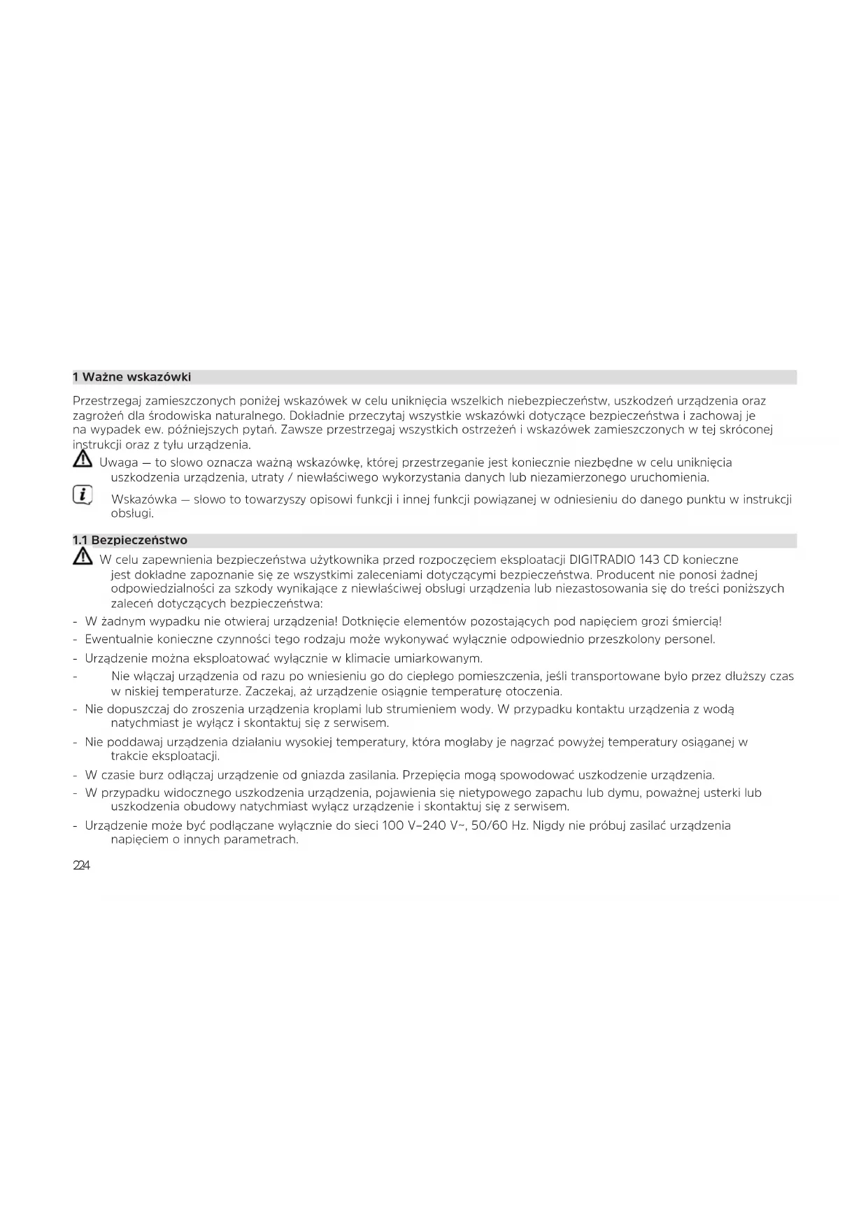W celu zapewnienia bezpieczeństwa użytkownika przed rozpoczęciem eksploatacji DIGITRADIO 143 CD konieczne jest dokładne zapoznanie się ze wszystkimi zaleceniami dotyczącymi bezpieczeństwa. Producent nie ponosi żadnej odpowiedzialności za szkody wynikające z niewłaściwej obsługi urządzenia lub niezastosowania się do treści poniższych zaleceń dotyczących bezpieczeństwa: - W żadnym wypadku nie otwieraj urządzenia! Dotknięcie elementów pozostających pod napięciem grozi śmiercią! - Ewentualnie konieczne czynności tego rodzaju może wykonywać wyłącznie odpowiednio przeszkolony personel. - Urządzenie można eksploatować wyłącznie w klimacie umiarkowanym. - Nie włączaj urządzenia od razu po wniesieniu go do ciepłego pomieszczenia, jeśli transportowane było przez dłuższy czas w niskiej temperaturze. Zaczekaj, aż urządzenie osiągnie temperaturę otoczenia. - Nie dopuszczaj do zroszenia urządzenia kroplami lub strumieniem wody. W przypadku kontaktu urządzenia z wodą natychmiast je wyłącz i skontaktuj się z serwisem. - Nie poddawaj urządzenia działaniu wysokiej temperatury, która mogłaby je nagrzać powyżej temperatury osiąganej w trakcie eksploatacji. - W czasie burz odłączaj urządzenie od gniazda zasilania. Przepięcia mogą spowodować uszkodzenie urządzenia. - W przypadku widocznego uszkodzenia urządzenia, pojawienia się nietypowego zapachu lub dymu, poważnej usterki lub uszkodzenia obudowy natychmiast wyłącz urządzenie i skontaktuj się z serwisem. - Urządzenie może być podłączane wyłącznie do sieci 100 V‒240 V~, 50/60 Hz. Nigdy nie próbuj zasilać urządzenia napięciem o innych parametrach.225