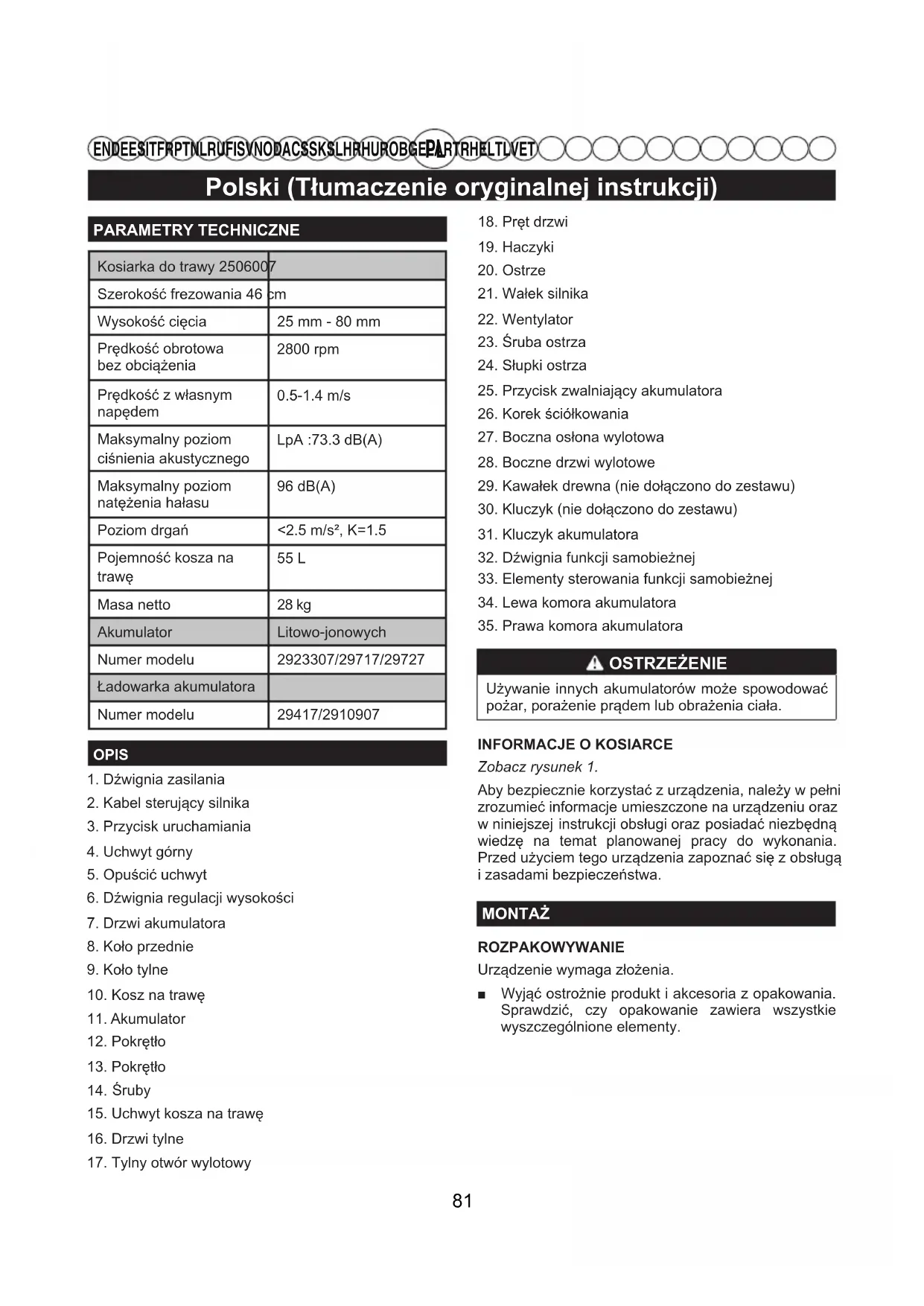 EN DE ES IT FR PT NL RU FI SV NO DA CS SK SL HR HU RO BG EL AR TR HE LT LV ET PARAMETRY TECHNICZNEKosiarka do trawy 2506007Szerokość frezowania 46 cmWysokość cięcia 25 mm - 80 mmPrędkość obrotowabez obciążenia2800 rpmPrędkość z własnym napędem0.5-1.4 m/sMaksymalny poziomciśnienia akustycznegoLpA :73.3 dB(A)Maksymalny poziomnatężenia hałasu96 dB(A)Poziom drgań <2.5 m/s², K=1.5Pojemność kosza na trawę 55 L Masa netto 28 kgAkumulator Litowo-jonowychNumer modelu 2923307/29717/29727Ładowarka akumulatoraNumer modelu 29417/2910907 OPIS 1. Dźwignia zasilania2. Kabel sterujący silnika3. Przycisk uruchamiania4. Uchwyt górny5. Opuścić uchwyt6. Dźwignia regulacji wysokości7. Drzwi akumulatora8. Koło przednie9. Koło tylne10. Kosz na trawę11. Akumulator12. Pokrętło13. Pokrętło Śruby15. Uchwyt kosza na trawę16. Drzwi tylne17. Tylny otwór wylotowy18. Pręt drzwi19. Haczyki20. Ostrze21. Wałek silnika22. Wentylator23. Śruba ostrza24. Słupki ostrza25. Przycisk zwalniający akumulatora26. Korek ściółkowania27. Boczna osłona wylotowa28. Boczne drzwi wylotowe29. Kawałek drewna (nie dołączono do zestawu)30. Kluczyk (nie dołączono do zestawu)31. Kluczyk akumulatora32. Dźwignia funkcji samobieżnej 33. Elementy sterowania funkcji samobieżnej34. Lewa komora akumulatora35. Prawa komora akumulatora OSTRZEŻENIE Używanie innych akumulatorów może spowodować pożar, porażenie prądem lub obrażenia ciała. INFORMACJE O KOSIARCEZobacz rysunek 1.Aby bezpiecznie korzystać z urządzenia, należy w pełni zrozumieć informacje umieszczone na urządzeniu oraz w niniejszej instrukcji obsługi oraz posiadać niezbędną wiedzę na temat planowanej pracy do wykonania. Przed użyciem tego urządzenia zapoznać się z obsługą i zasadami bezpieczeństwa.MONTAŻROZPAKOWYWANIEUrządzenie wymaga złożenia. ■ Wyjąć ostrożnie produkt i akcesoria z opakowania. Sprawdzić, czy opakowanie zawiera wszystkie wyszczególnione elementy. 81Polski (Tłumaczenie oryginalnej instrukcji)