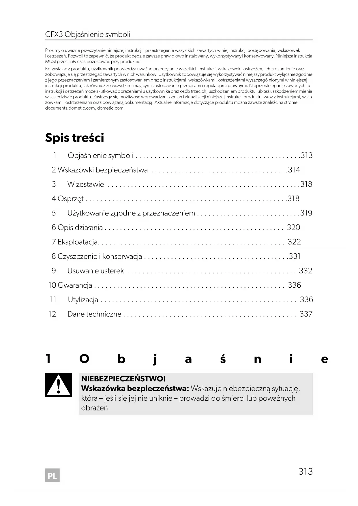 - Prosimy o uważne przeczytanie niniejszej instrukcji i przestrzeganie wszystkich zawartych w niej instrukcji postępowania, wskazówek i ostrzeżeń. Pozwoli to zapewnić, że produkt będzie zawsze prawidłowo instalowany, wykorzystywany i konserwowany. Niniejsza instrukcja MUSI przez cały czas pozostawać przy produkcie. Korzystając z produktu, użytkownik potwierdza uważne przeczytanie wszelkich instrukcji, wskazówek i ostrzeżeń, ich zrozumienie oraz zobowiązuje się przestrzegać zawartych w nich warunków. Użytkownik zobowiązuje się wykorzystywać niniejszy produkt wyłącznie zgodnie z jego przeznaczeniem i zamierzonym zastosowaniem oraz z instrukcjami, wskazówkami i ostrzeżeniami wyszczególnionymi w niniejszej instrukcji produktu, jak również ze wszystkimi mającymi zastosowanie przepisami i regulacjami prawnymi. Nieprzestrzeganie zawartych tu instrukcji i ostrzeżeń może skutkować obrażeniami u użytkownika oraz osób trzecich, uszkodzeniem produktu lub też uszkodzeniem mienia w sąsiedztwie produktu. Zastrzega się możliwość wprowadzania zmian i aktualizacji niniejszej instrukcji produktu, wraz z instrukcjami, wska- zówkami i ostrzeżeniami oraz powiązaną dokumentacją. Aktualne informacje dotyczące produktu można zawsze znaleźć na stronie documents.dometic.com, dometic.com. Spis treści 1 Objaśnienie symboli p. 313