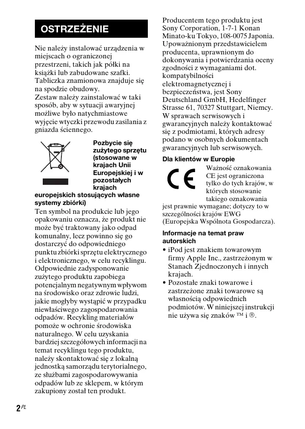 Rätten till ändringar av utförande och tekniska data utan föregående meddelande förbehålles. 13SE OSTRZEŻENIE Nie należy instalować urządzenia w miejscach o ograniczonej przestrzeni, takich jak półki na książki lub zabudowane szafki. Tabliczka znamionowa znajduje się na spodzie obudowy. Zestaw należy zainstalować w taki sposób, aby w sytuacji awaryjnej możliwe było natychmiastowe wyjęcie wtyczki przewodu zasilania z gniazda ściennego. Pozbycie się zużytego sprzętu (stosowane w krajach Unii Europejskiej i w pozostałych krajach europejskich stosujących własne systemy zbiórki) Ten symbol na produkcie lub jego opakowaniu oznacza, że produkt nie może być traktowany jako odpad komunalny, lecz powinno się go dostarczyć do odpowiedniego punktu zbiórki sprzętu elektrycznego i elektronicznego, w celu recyklingu. Odpowiednie zadysponowanie zużytego produktu zapobiega potencjalnym negatywnym wpływom na środowisko oraz zdrowie ludzi, jakie mogłyby wystąpić w przypadku niewłaściwego zagospodarowania odpadów. Recykling materiałów pomoże w ochronie środowiska naturalnego. W celu uzyskania bardziej szczegółowych informacji na temat recyklingu tego produktu, należy skontaktować się z lokalną jednostką samorządu terytorialnego, ze służbami zagospodarowywania odpadów lub ze sklepem, w którym zakupiony został ten produkt. 2PL Producentem tego produktu jest Sony Corporation, 1-7-1 Konan Minato-ku Tokyo, 108-0075 Japonia. Upoważnionym przedstawicielem producenta, uprawnionym do dokonywania i potwierdzania oceny zgodności z wymaganiami dot. kompatybilności elektromagnetycznej i bezpieczeństwa, jest Sony Deutschland GmbH, Hedelfinger Strasse 61, 70327 Stuttgart, Niemcy. W sprawach serwisowych i gwarancyjnych należy kontaktować się z podmiotami, których adresy podano w osobnych dokumentach gwarancyjnych lub serwisowych. Dla klientów w Europie Ważność oznakowania CE jest ograniczona tylko do tych krajów, w których stosowanie takiego oznakowania jest prawnie wymagane; dotyczy to w szczególności krajów EWG (Europejska Wspólnota Gospodarcza). Informacje na temat praw autorskich